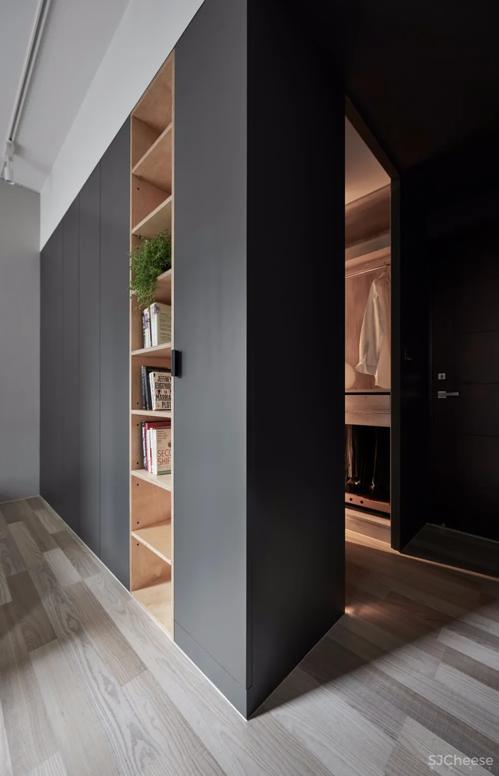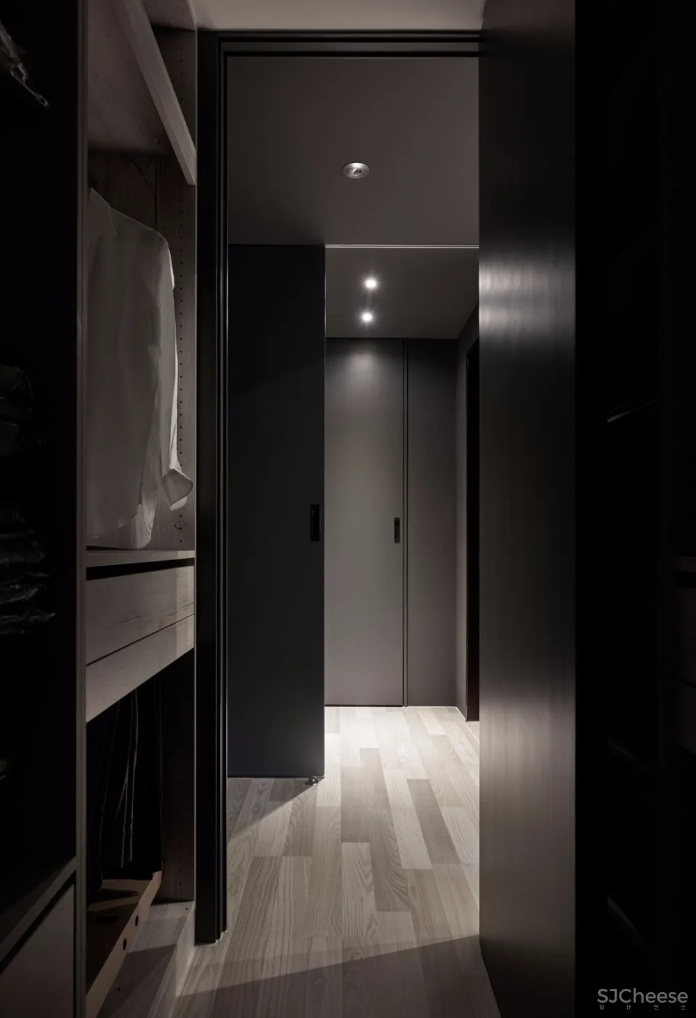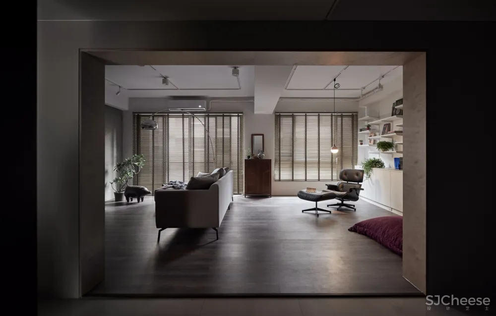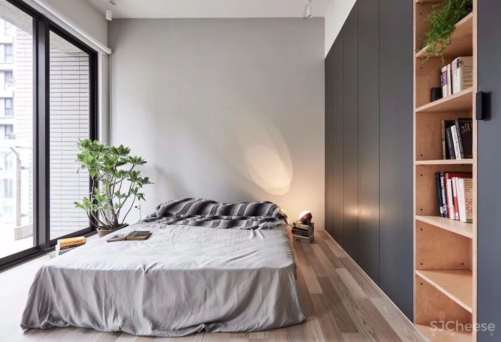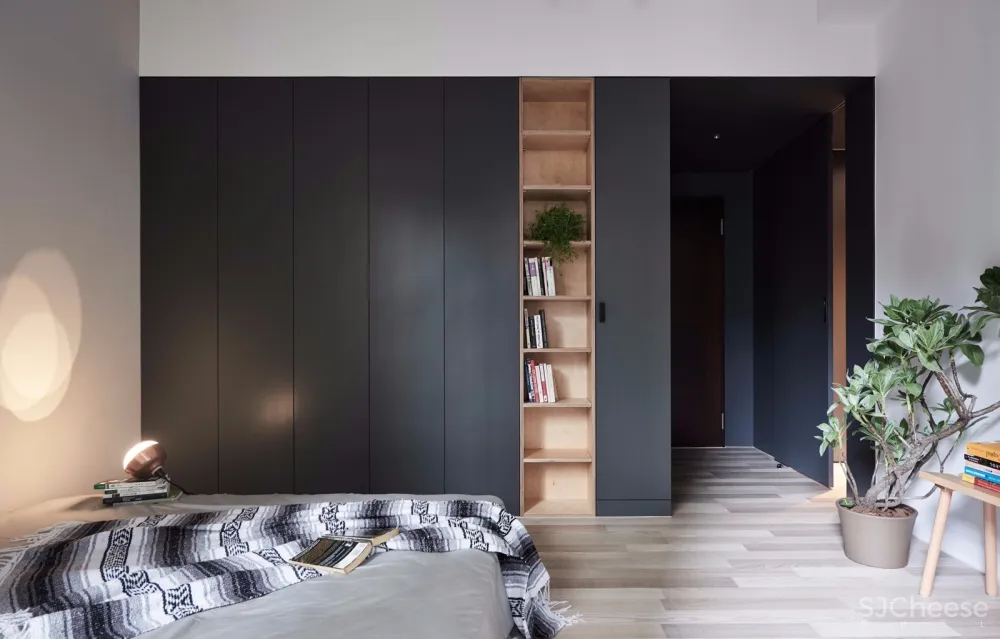 与公共区采用以量体置入空间的手法,卧室以整个深灰色量体定义主卧入口衣帽间范围,灰色调从浴室跨过房间入口走道直到衣帽间,让原本零碎的空间能够整合成为一体,使得衣帽间与主卧床铺区的空间可以清楚的界定。