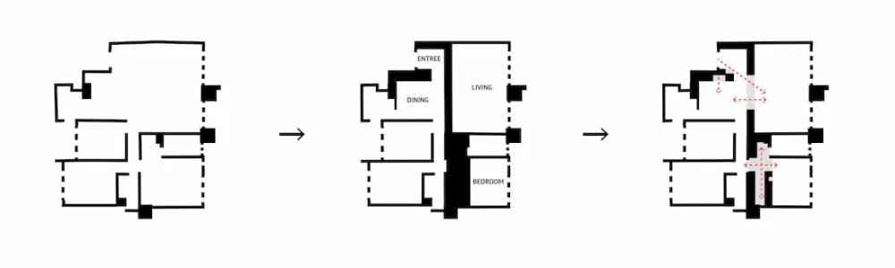 在整修前原本客厅跟餐厅界线模糊,大门跟餐厅门也面向室外 ,我们将整体的平面以美术馆的方式去思考,明确的区分出展示收藏、聚会、休息的空间。首先以桦木长型量体与转角黑色量体介入空间借以清楚定义出客厅、书房、餐厅、玄关的空间,并解决大门跟餐厅门朝向室外开启(穿堂煞)的问题。