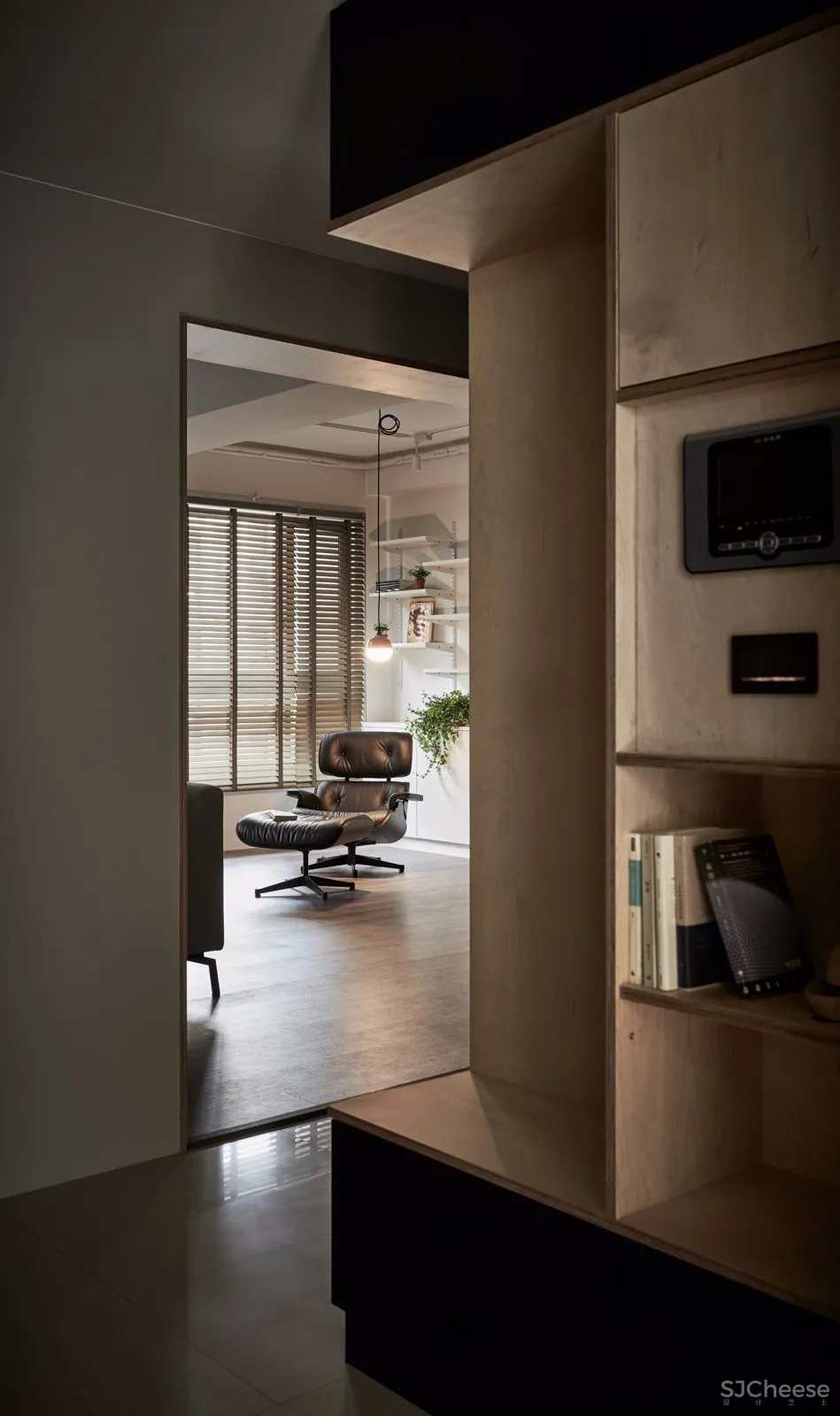 整体材料使用上以极简化为原则,除了深灰色量体及桦木书架,其他的部分都原则上留白,让业主本身的经典家具及书籍收藏成为空间上的主角,在客厅阅读区的背面在增加了矮柜及可活动的层板,但是都维持白色,不抢去桦木书柜墙的主要定位。