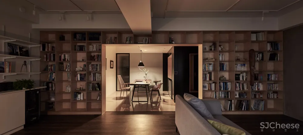长形的量体界定了客厅及餐厅,靠客厅侧为一座格子状分割的柜子,可供收藏书籍。书柜的背面与原始的墙面结合,由中央的开口向玄关及走廊的方向延伸形成展示墙,配合上方的投射灯,让主人的收藏的画作得以如同在美术馆一般的展示。书墙虽然分隔了客厅与餐厅,但中央开口让两侧的视觉能够连通,并且形成框景,让空间产生不同深度的层次。