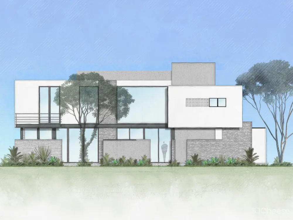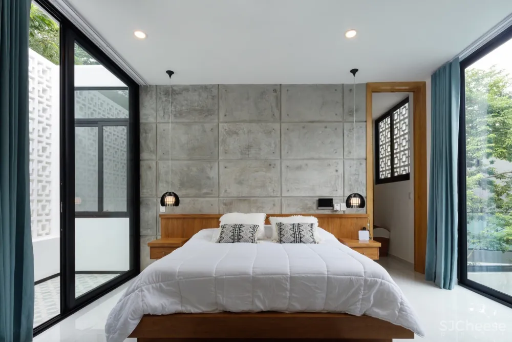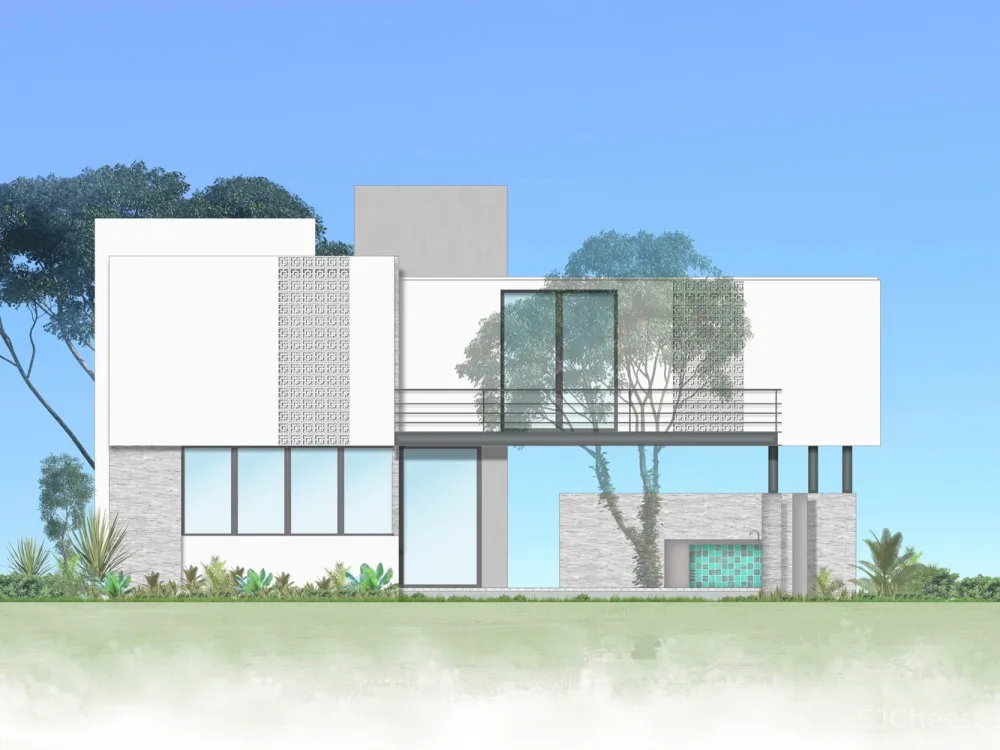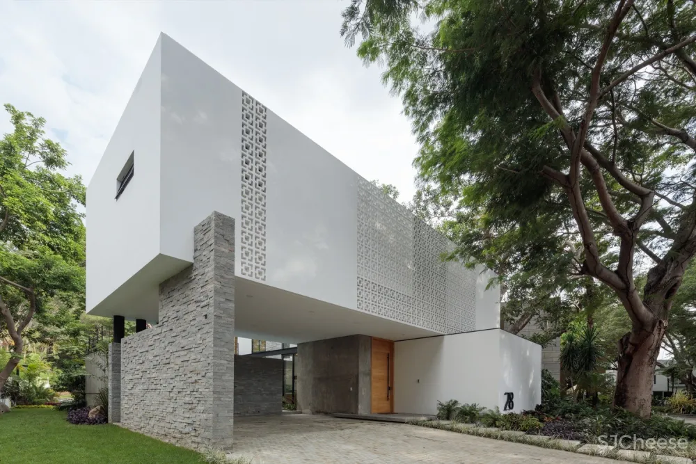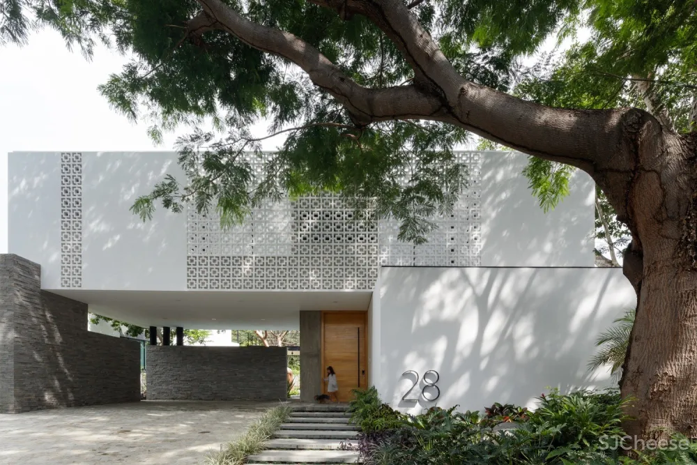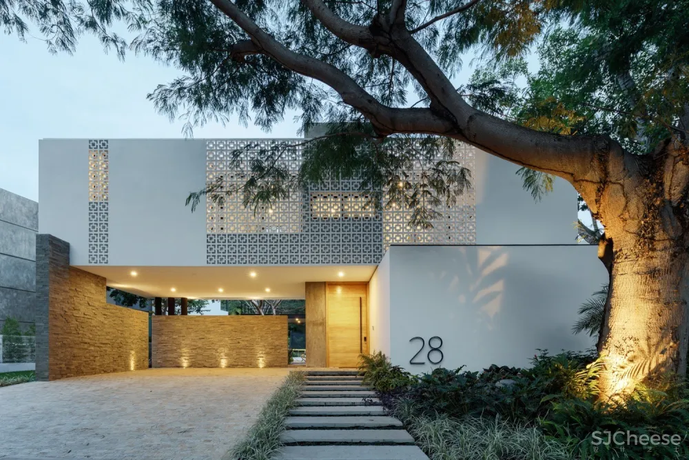 住宅的“U”形地板将底层的社交空间和共存空间以及上层的私人空间分隔开来,营造了一个完全的室内环境。在白色混凝土中手工塑造的格子,逐渐融入到墙体中,试图在住宅体量中创造一个统一的体量。
