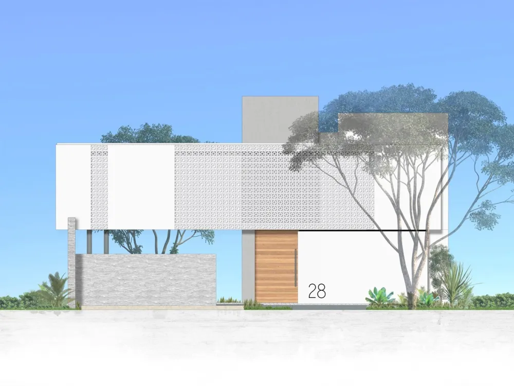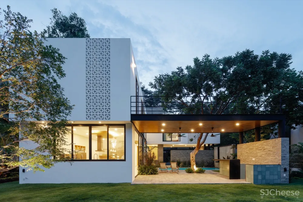 白天,白色墙壁上的格子屏风逐渐消失,夜晚,布兰卡Casa la Blanca的立面上呈现出光影屏障。一种典型的墨西哥格子,在科利马州、城市和海岸被广泛使用了几十年,以保护自己免受强烈的半湿润温暖气候及其强烈的气候变化的影响。它被用作保护房屋的皮肤,赋予隐私、安全、室内外光影效果。