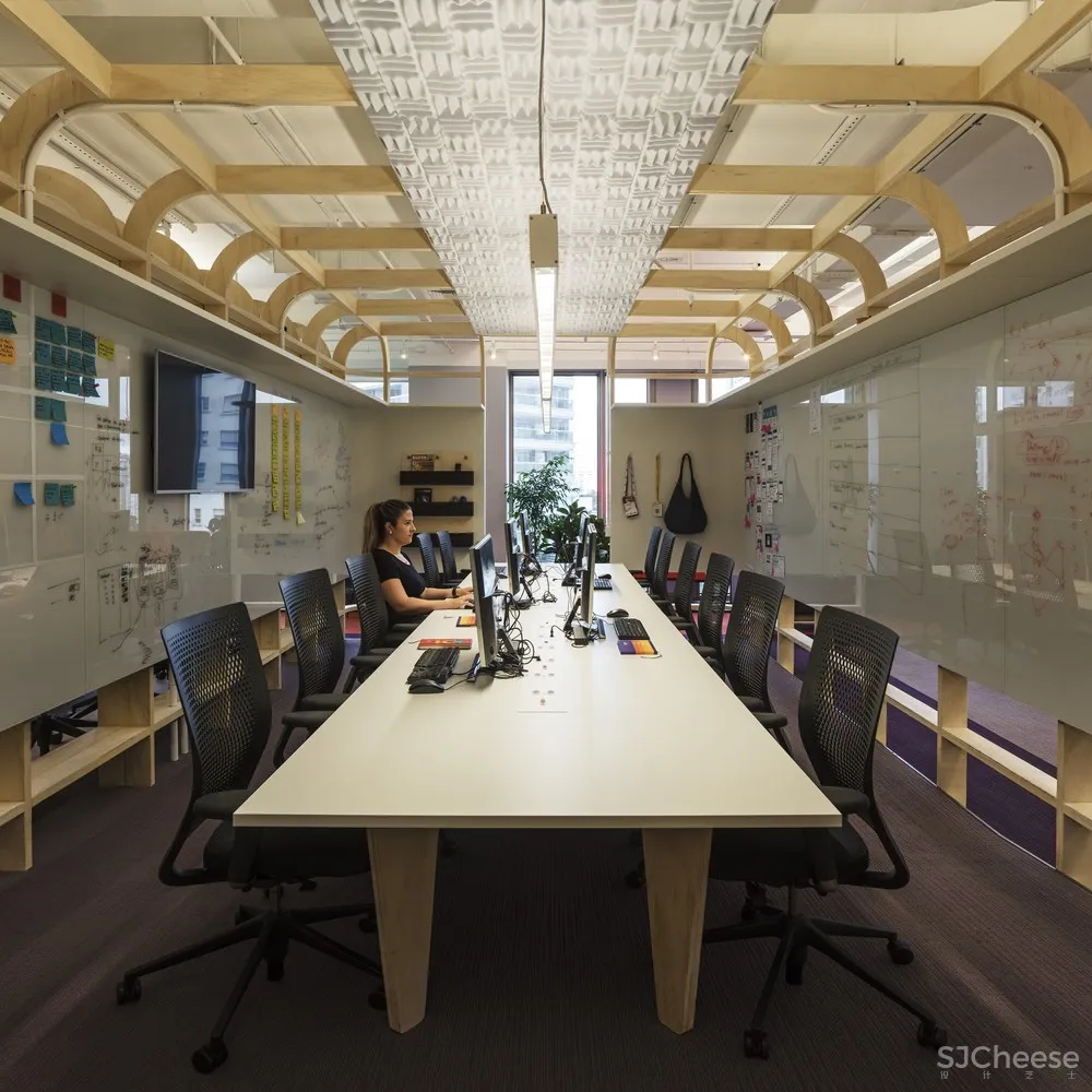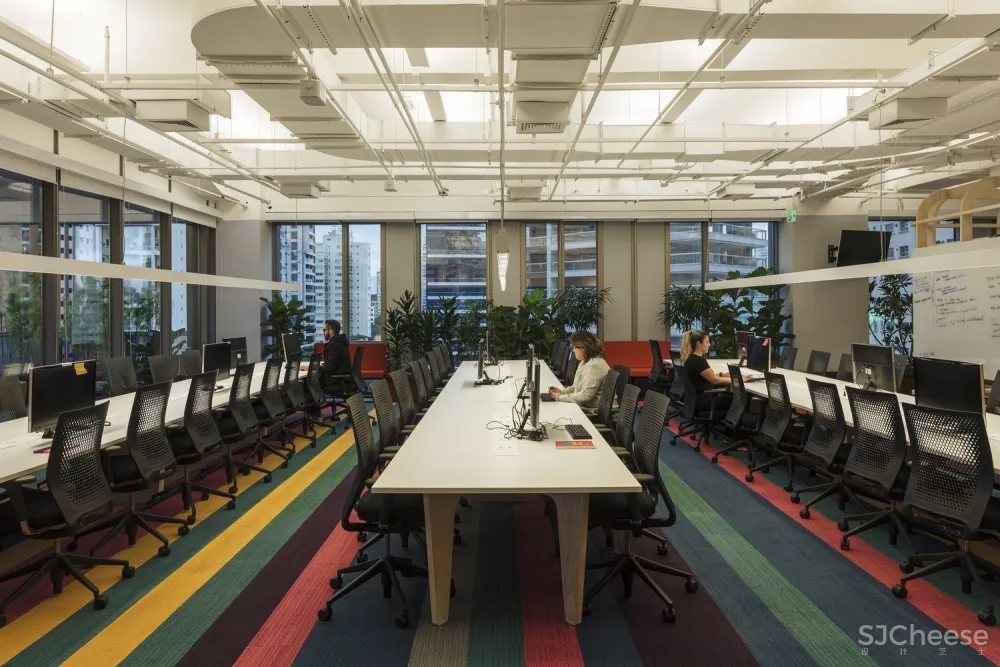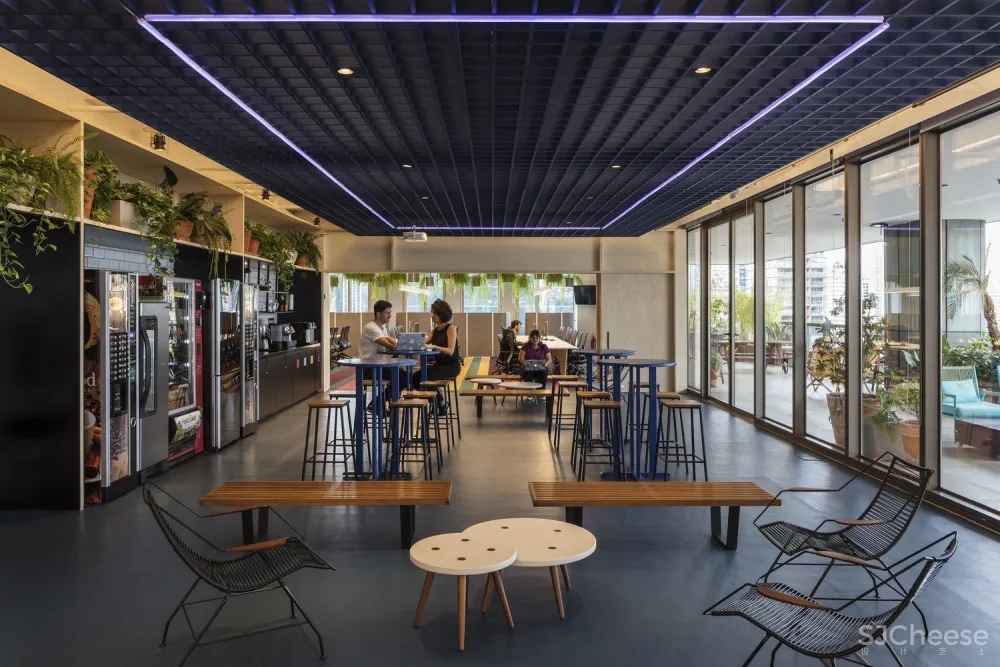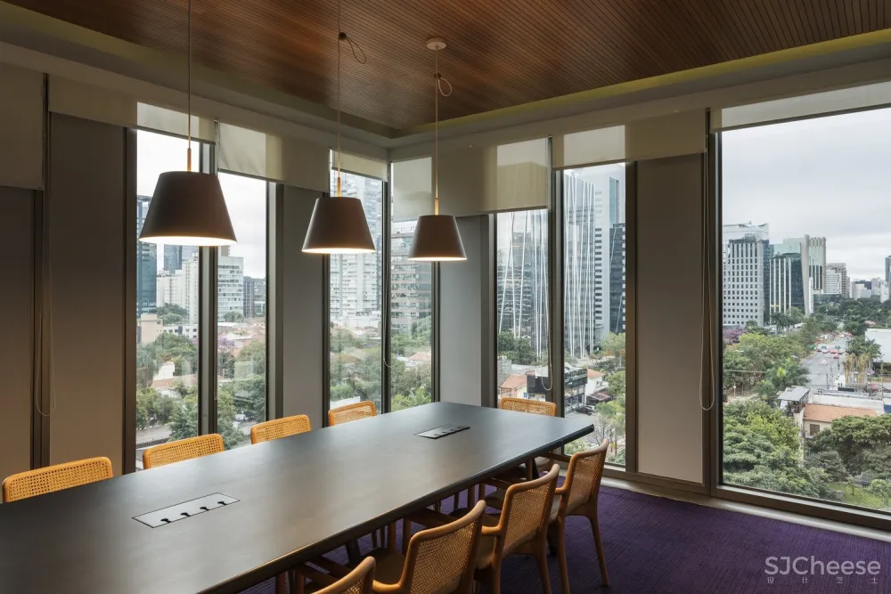 尤斯的所有木制品设计都受到fablabs的启发,结合了海军胶合板在CNC切割时的粗犷材质。整个空间靠近窗户,景观在视觉上变暖,提高了团队工作环境的质量。来自巴西设计师的家具和物品摆放在所有的空间,邀请参观者参加一个关于当代巴西设计的课程,课程中有来自专业人士的物品,如Jader Almeida, Carol Gay, Ovo design, Lucas Neves, Zanini de Zanine和Felipe Protti。两个最大的工作休息室的沙发系列是Guto Requena工作室为这个项目设计的。