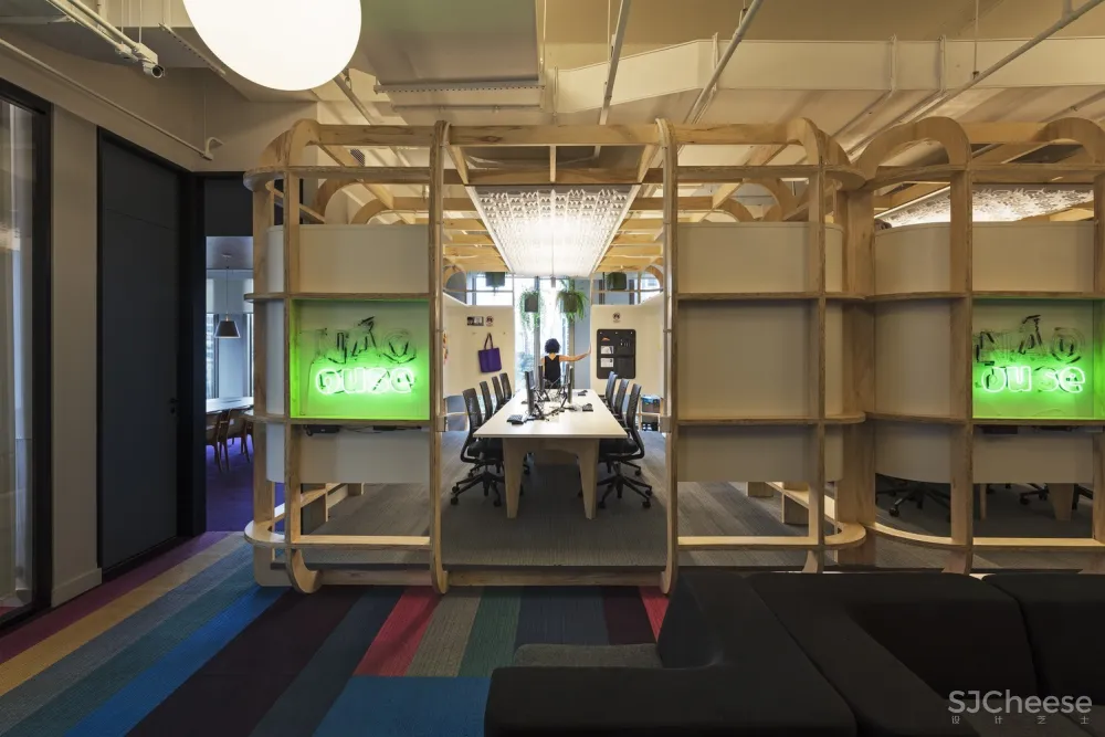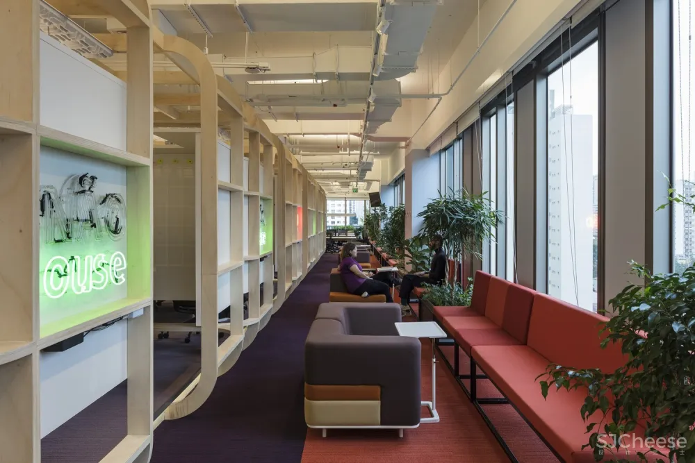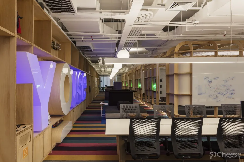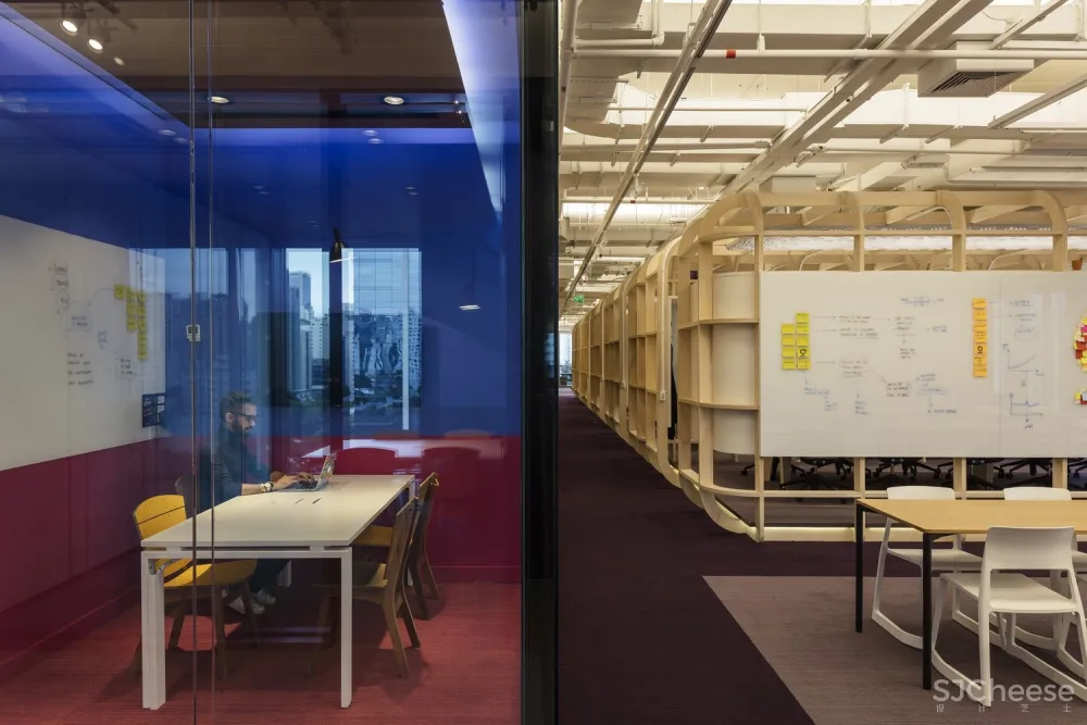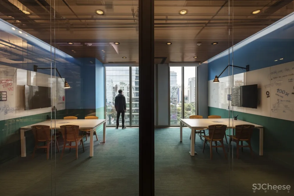 尤斯的所有木制品设计都受到fablabs的启发,结合了海军胶合板在CNC切割时的粗犷材质。整个空间靠近窗户,景观在视觉上变暖,提高了团队工作环境的质量。来自巴西设计师的家具和物品摆放在所有的空间,邀请参观者参加一个关于当代巴西设计的课程,课程中有来自专业人士的物品,如Jader Almeida, Carol Gay, Ovo design, Lucas Neves, Zanini de Zanine和Felipe Protti。两个最大的工作休息室的沙发系列是Guto Requena工作室为这个项目设计的。