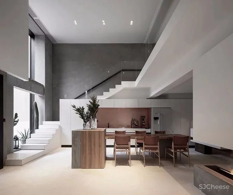 原建筑为地面以上2.8米层高四层空间等分布置,以轴线分布,拆除一二层空间前半部分楼板做挑空,楼梯侧移,重新规划出空间的动线关系,以中空为中心,依次展开入住、待客、用餐等功能,将白色方块悬浮于空中,简化原先复杂的立面关系,同时保留拆除时的混凝土梁,在现有空间里展现建造痕迹。