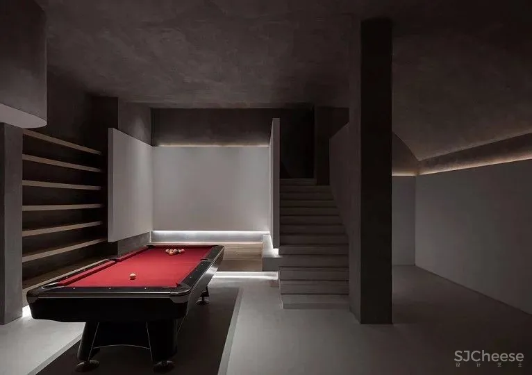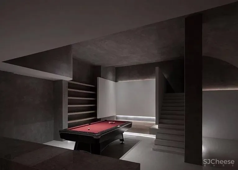 地下室为一个方形空间,把廊吧布置于地下室,提供小型聚会和娱乐的功能,为打破原先单调的空间,顶面采用弧面系统,同时将墙面上的体块以悬浮的状态呈现,通过切割使原建筑的楼梯成为一个独立的审美体系,增加空间的趣味性。
