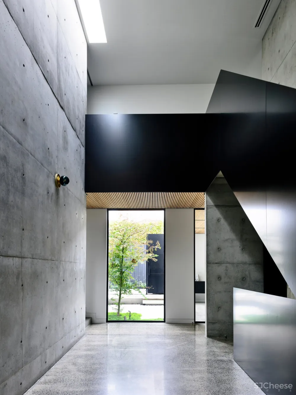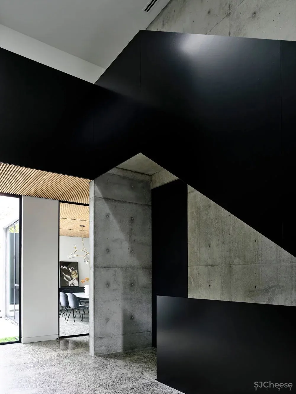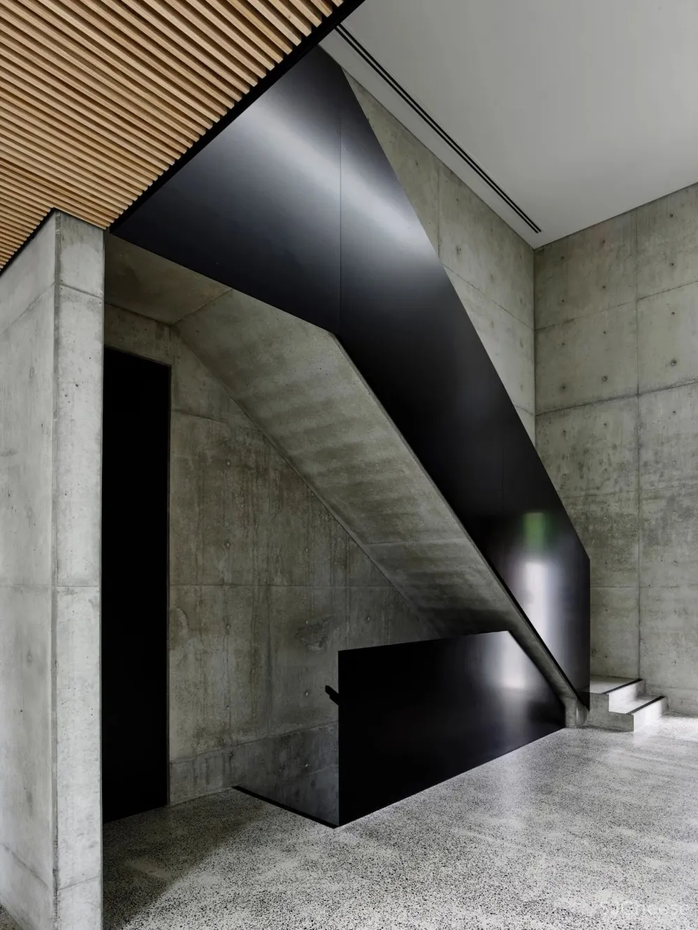 内墙采用清水模结构,再辅以天然木材和不同材质的黑色饰面,营造质感丰富的内部空间。
