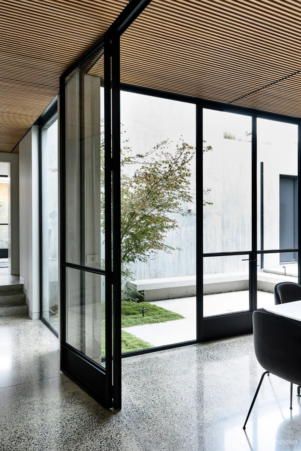 有别于封闭性好的外墙,起居室和走廊面向庭院而建,安装了开阔的玻璃门,让屋里光照充足,从外面看很难想象会有这样敞亮的环境。