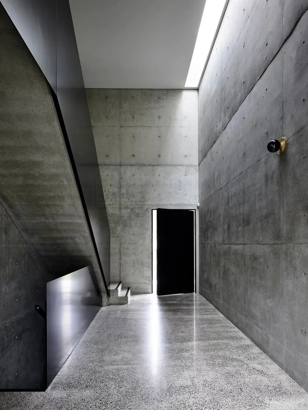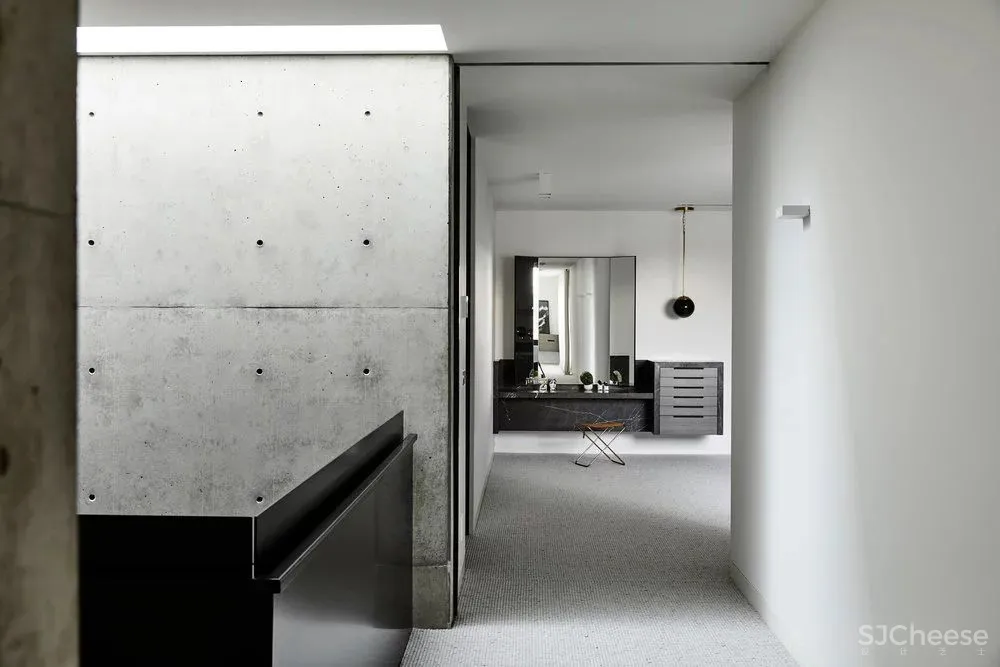 挑空设计的走廊,让光线从房顶天窗倾泻而下,使混凝土墙面产生细微的颜色跟纹理变化。