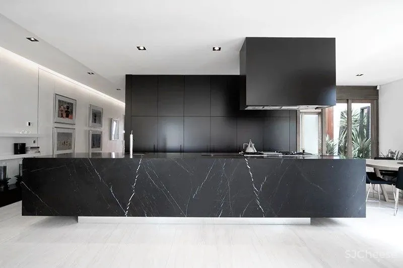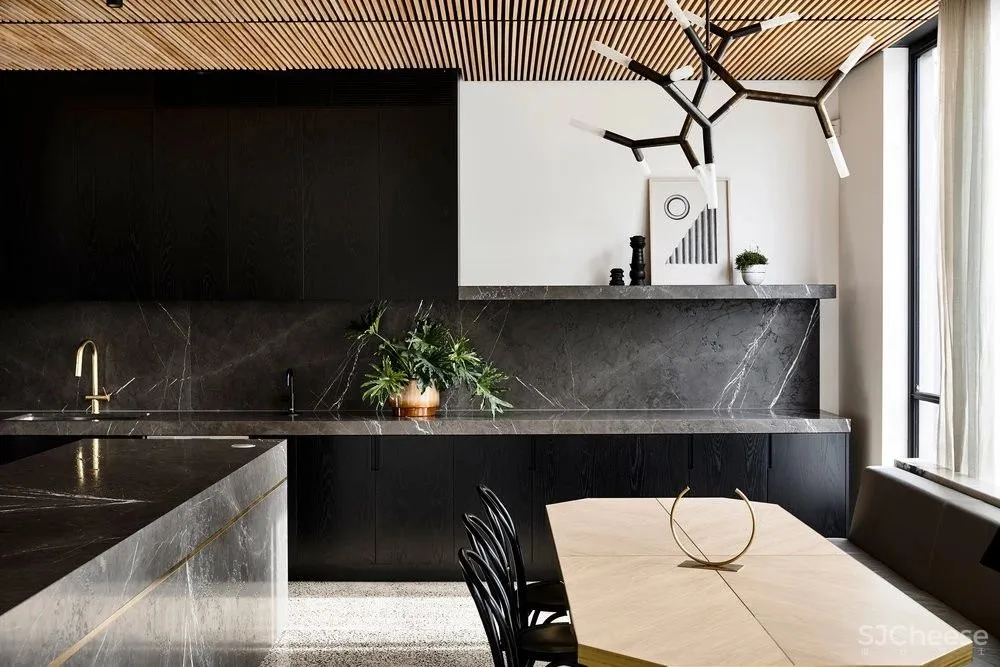 厨房使用透黑精致的意大利灰石做台面和防溅板,装饰着黄铜镶边,搭配黑色木纹饰面,散发着低调的奢华感。