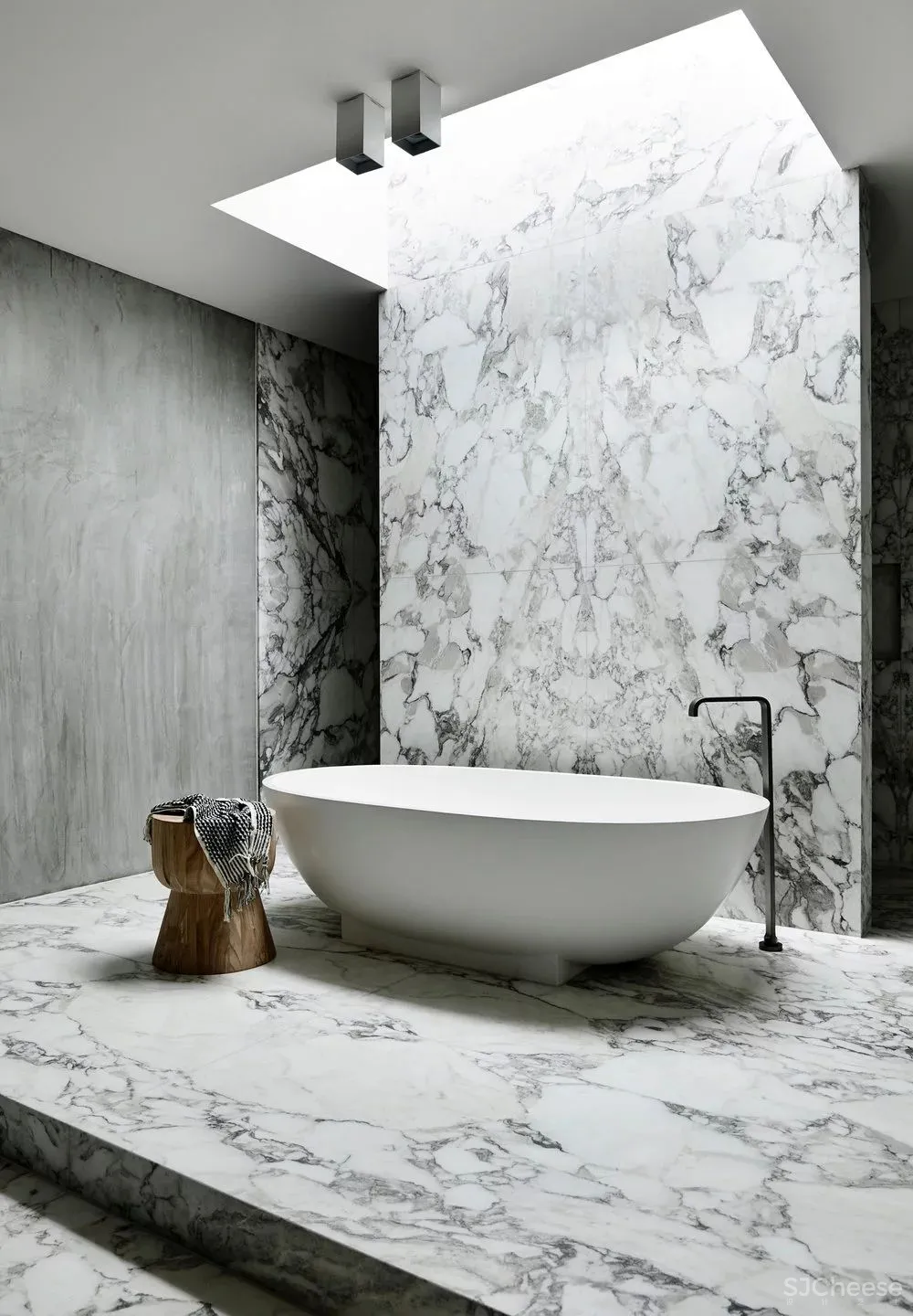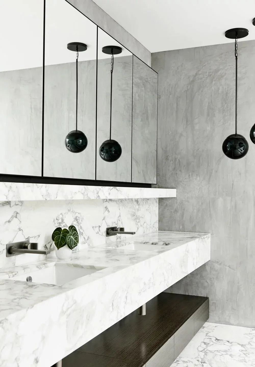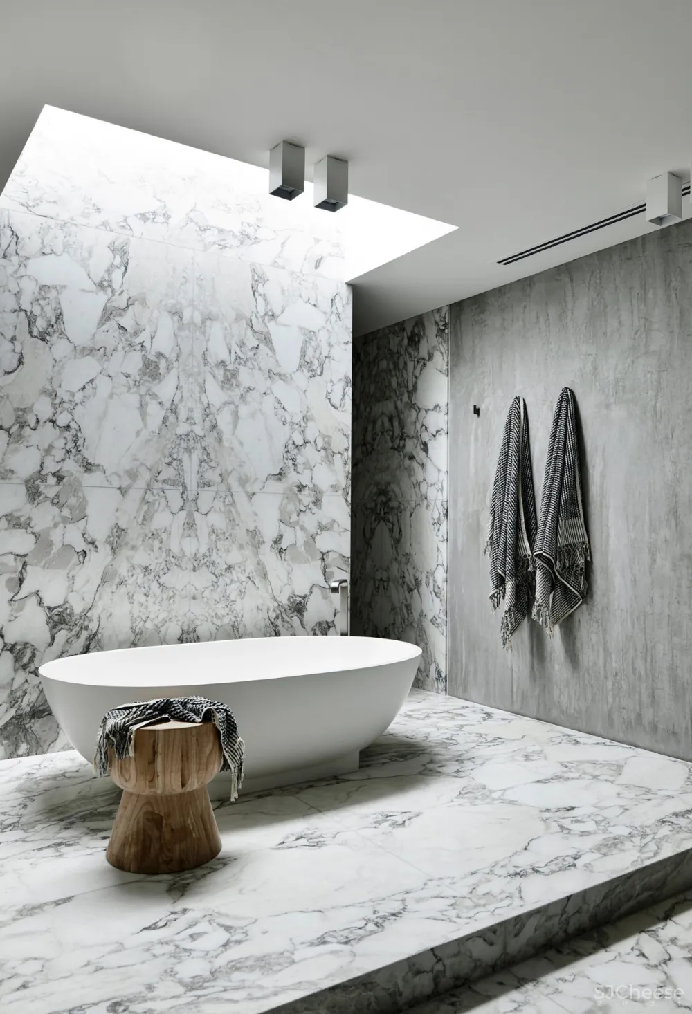 主人房的卫生间选用大花白石,天然大理石的纹理搭配立体简约的水龙头和顶灯,华丽深沉,更加相得益彰。