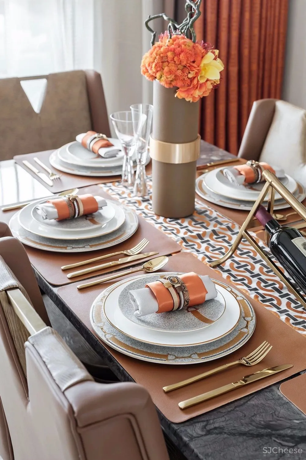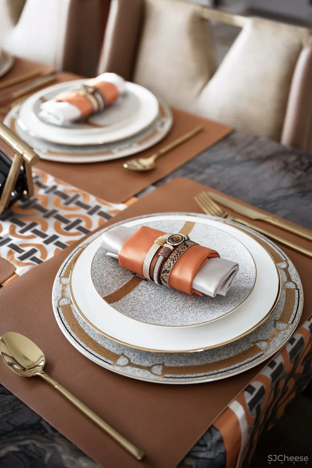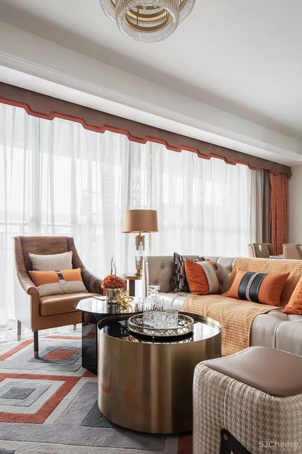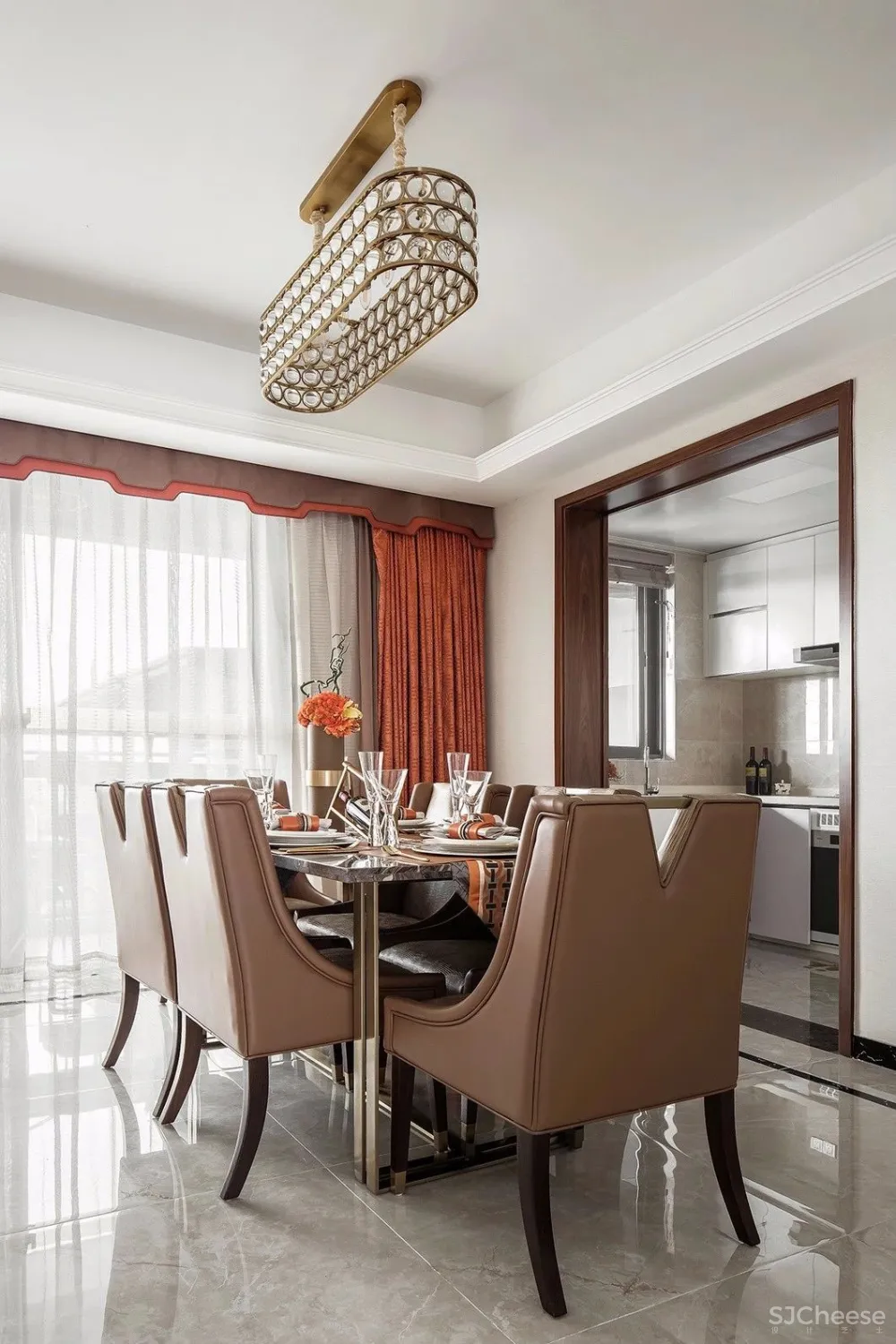 纵跃大开间的客餐厅拥有客观的尺度感,爱马仕橙色及金色配饰,则瞬间让整个氛围活跃起来。设计发挥空间优势,通过合理而巧妙的手法划分功能区间,结合精致得体的配饰,让明媚的阳光得以在空间里随意跳跃,自由翩跹流淌,为居者提供体贴舒适的居家时光。