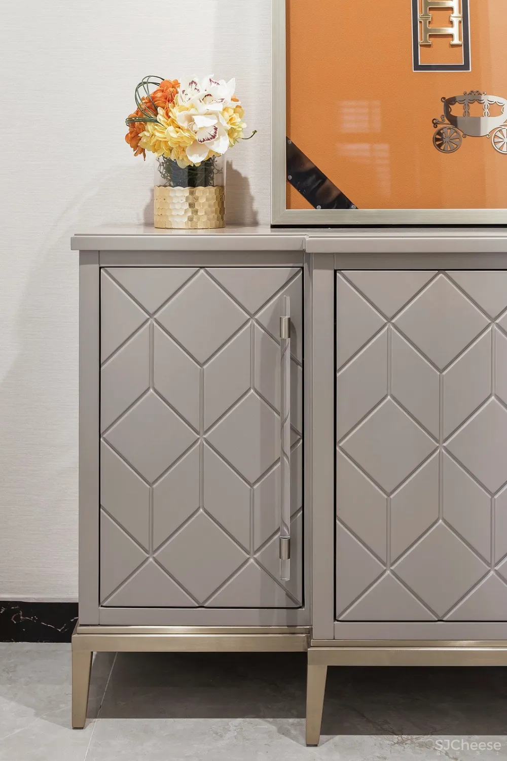 灰色的菱形格纹地毯纹络凹凸起伏,与沙发形成不同色阶的对比与延伸。高贵的灰色大理石为基调搭配出低调奢华之感,茶几拉丝面金属材质点亮了空间活力,空间疏密有致,调节空间节奏感,进而使环境和谐有序。