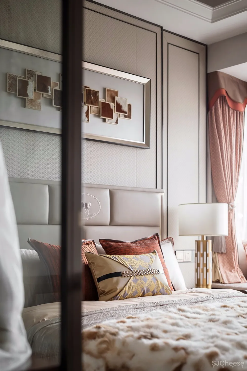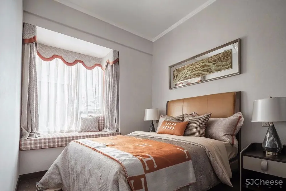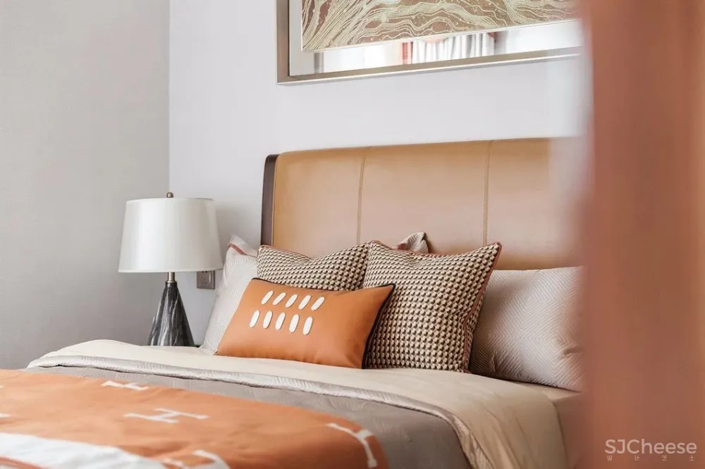 父母房暖色调的床品和温润的木饰面相得益彰,显得尤其安逸。床头的线团壁饰很好的勾勒出晚年的幸福生活,牵手漫步,不需要繁琐,简单的享受生活,携手相伴……