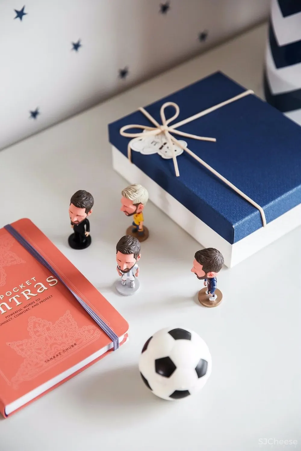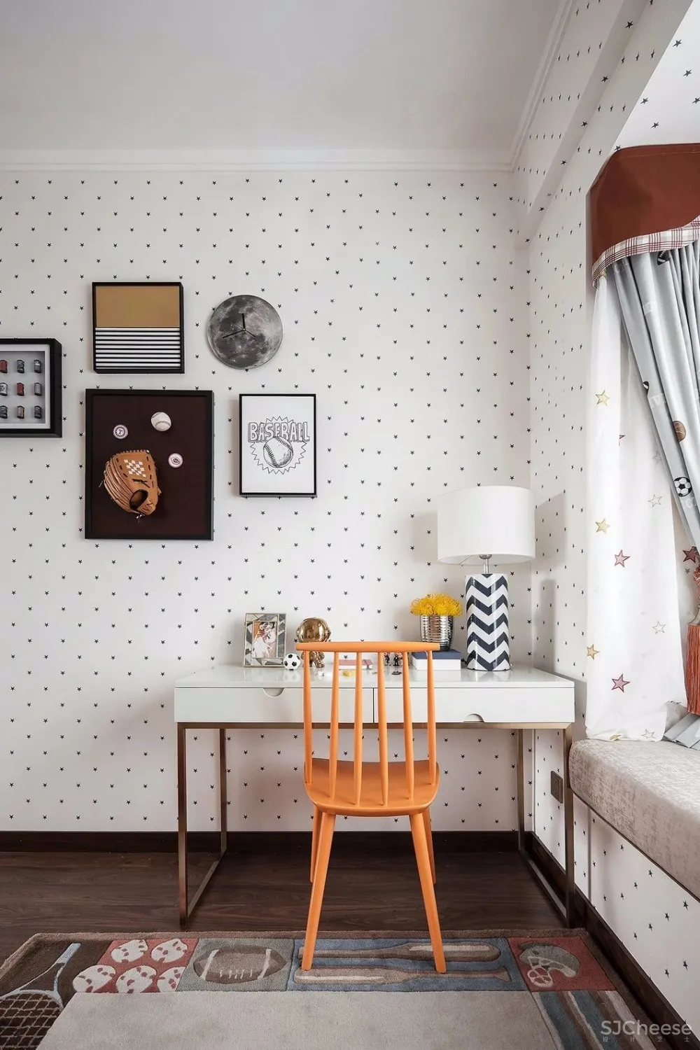 儿童空间自由充满趣味,摒弃了常规的空间布置。橙色为主色调的家具、床品突显了当代主义的整体基调,书桌上踢球的球员、床边的橄榄球套装无不通往畅想的世界。