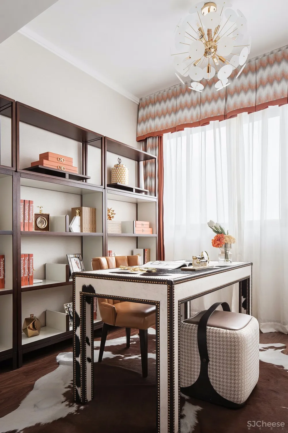 胡桃木色与奶白色调木饰面搭配的书架沉稳内敛,点缀些橙色与咖色,在静谧中藏匿着奔腾而有活力的内心。一盏蘑菇灯,不仅是功能上的满足,也是业主对品质生活的追求,结合经典款家具为整个家增添了品质感。