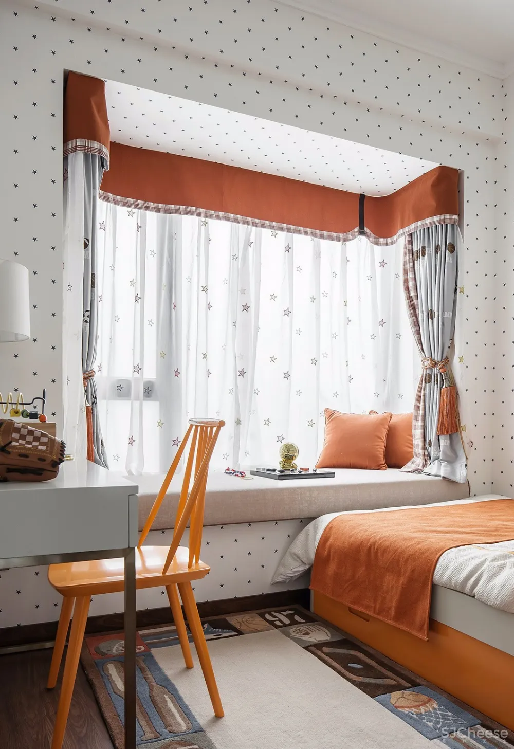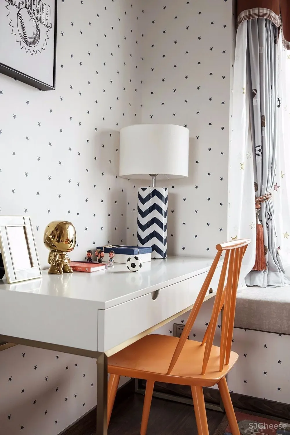 蓝白相间的陶瓷台灯使空间材质更加丰富,亮黄和橙色的大量运用,这是一个创意无限、童趣缤纷的空间。