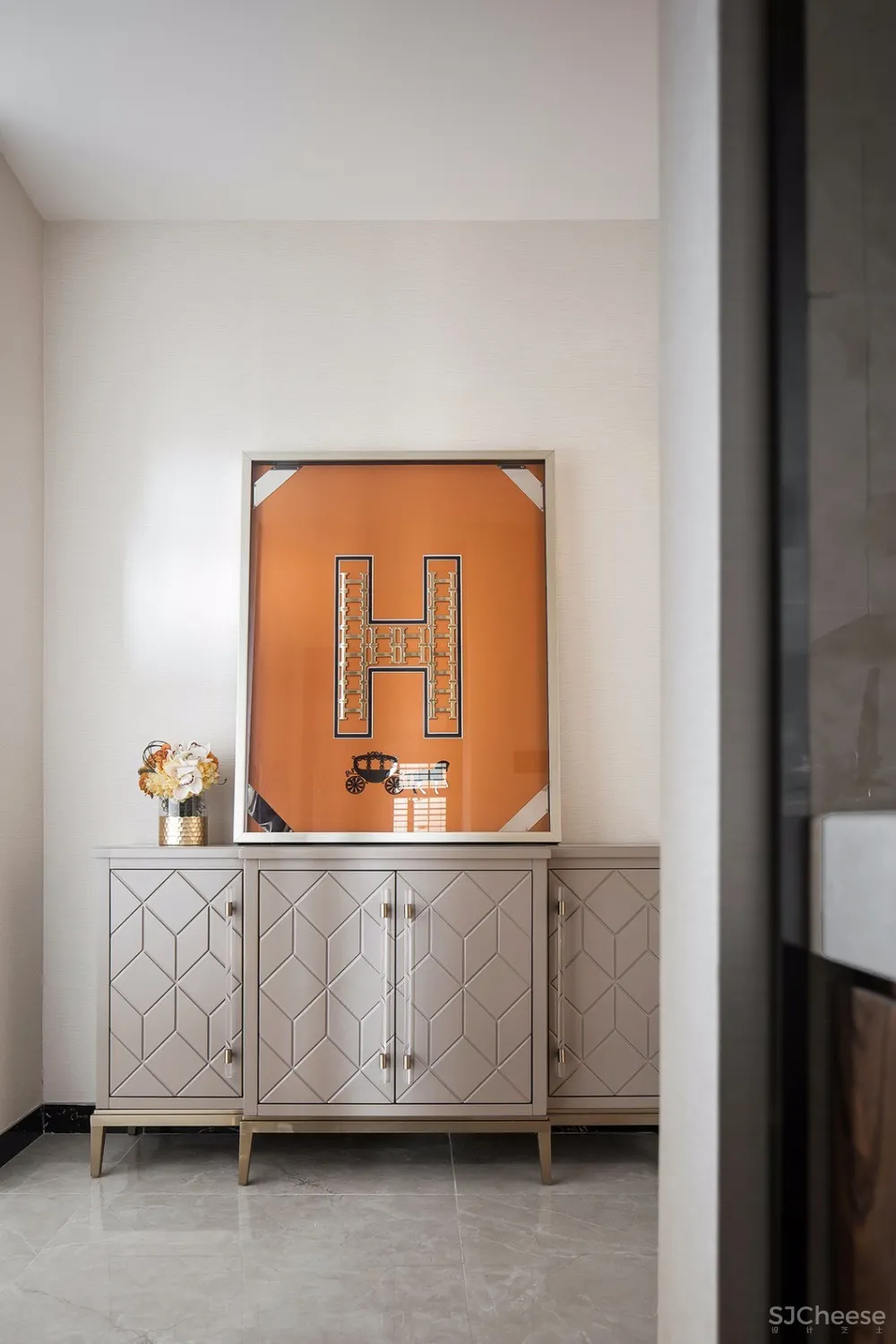 空间以橙色为主色调开启了“摩登”艺术之旅,由HERMES丝巾装裱而成艺术挂画流畅大气,一抹橙色激活墙面的生活气息,别致的家具也处处透着主人的身份与生活品质。