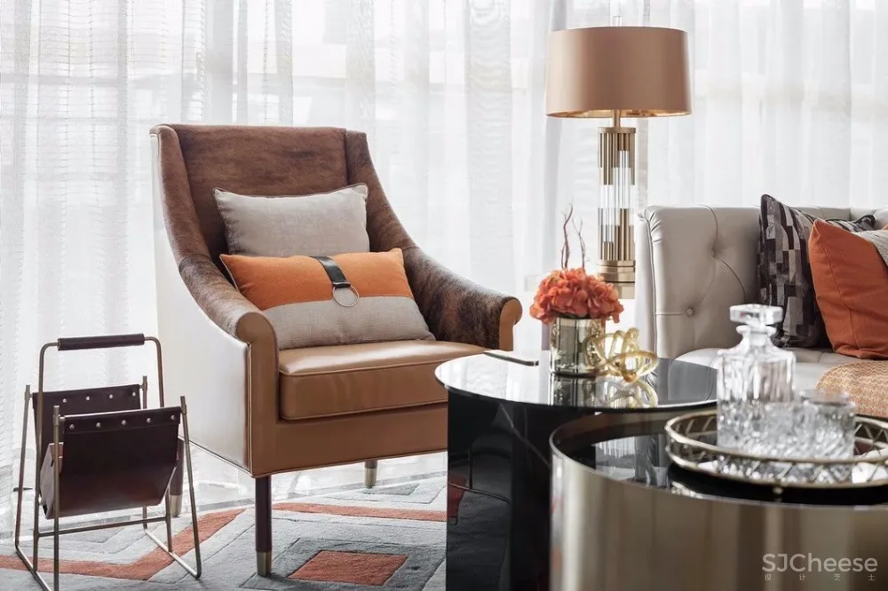 客厅重点突显家具品质在空间中的重要性,橙色的毛皮扶手椅是整个空间不安份的元素,造型舒展,仿佛向人发出邀请,落座瞬间,又有一种被温暖环抱,拥有自己一片独立私密的小天地的体验。