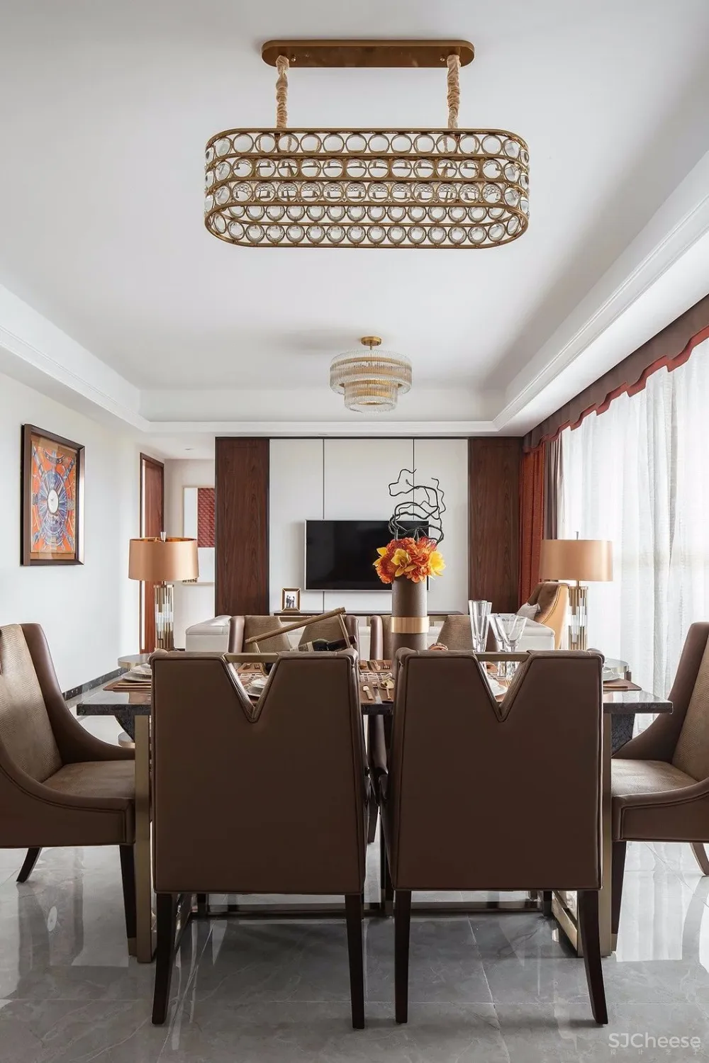 餐厅作为厨房与客厅的链接,在色调和材料的使用上,保持了空间的连贯性,一盏夺目的水晶光影映照在现代简约的大理石台面上,奢华皮椅搭配精致餐具,别具一格,细枝末节处让生活更添艺术色彩。