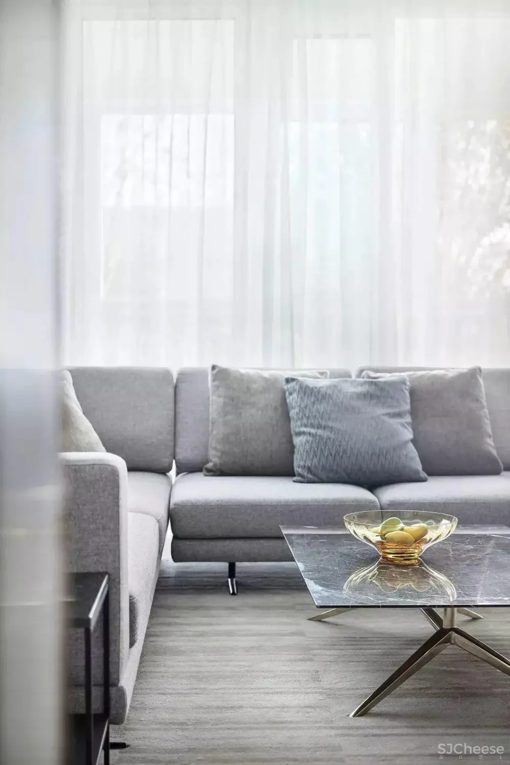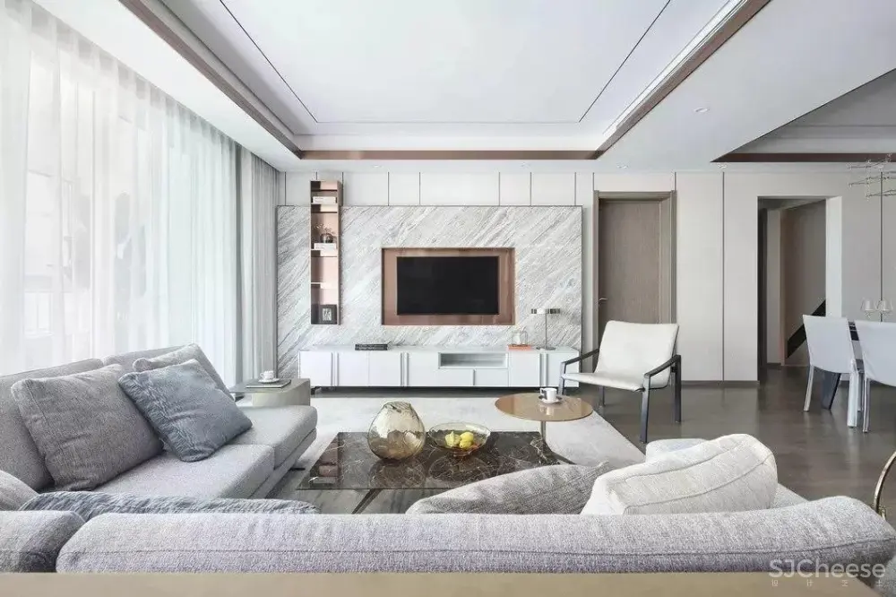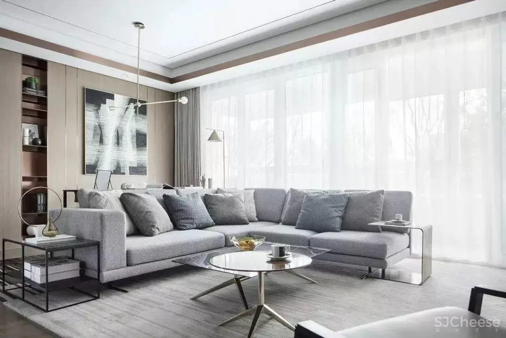 得益于落地窗为室内引入明亮光线,映衬出材质的自然肌理,铺陈简约现代的情景氛围,为家人互动提供了理想场地。