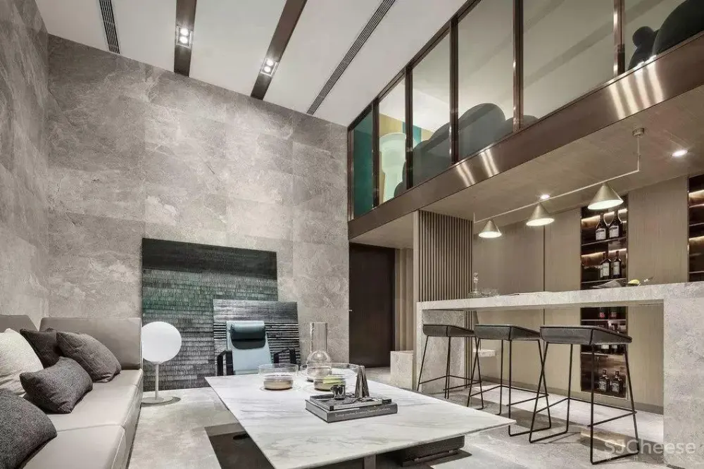 步入地下室,高挑空的结构尽显开阔与层次,这里也是能为每位家庭成员制造快乐记忆的场所。材质上冷暖结合、刚柔并济,视觉上纵横有序、流动自如。
