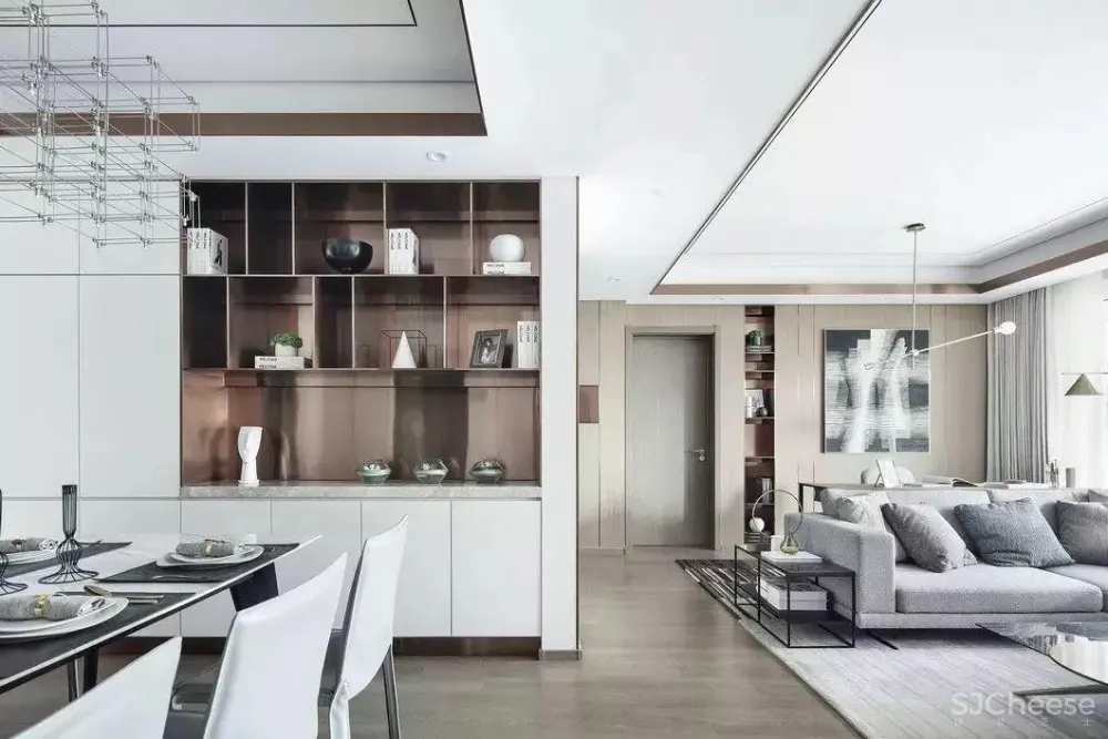 以实用美学视角借助原结构隔墙,划分玄关、餐厅和客厅。同时内嵌置物区的手法在三区域统一运用,形成协合呼应,藏秀并举。