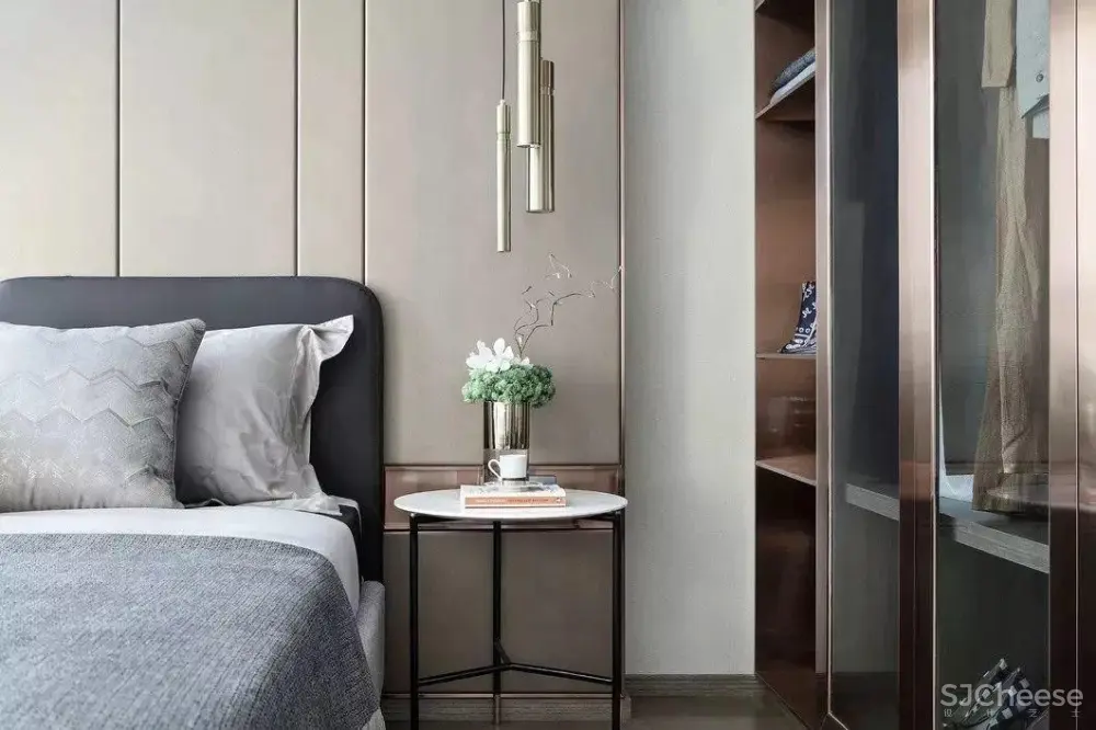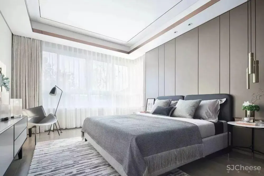 主卧顶面、立面均可见客餐厅的手法,呈现沉静理智。吊灯与落地灯呼应,表现出细腻的质感层次,于时尚别致中暗藏迷人细节。阳光缓缓渗入,温暖流淌。