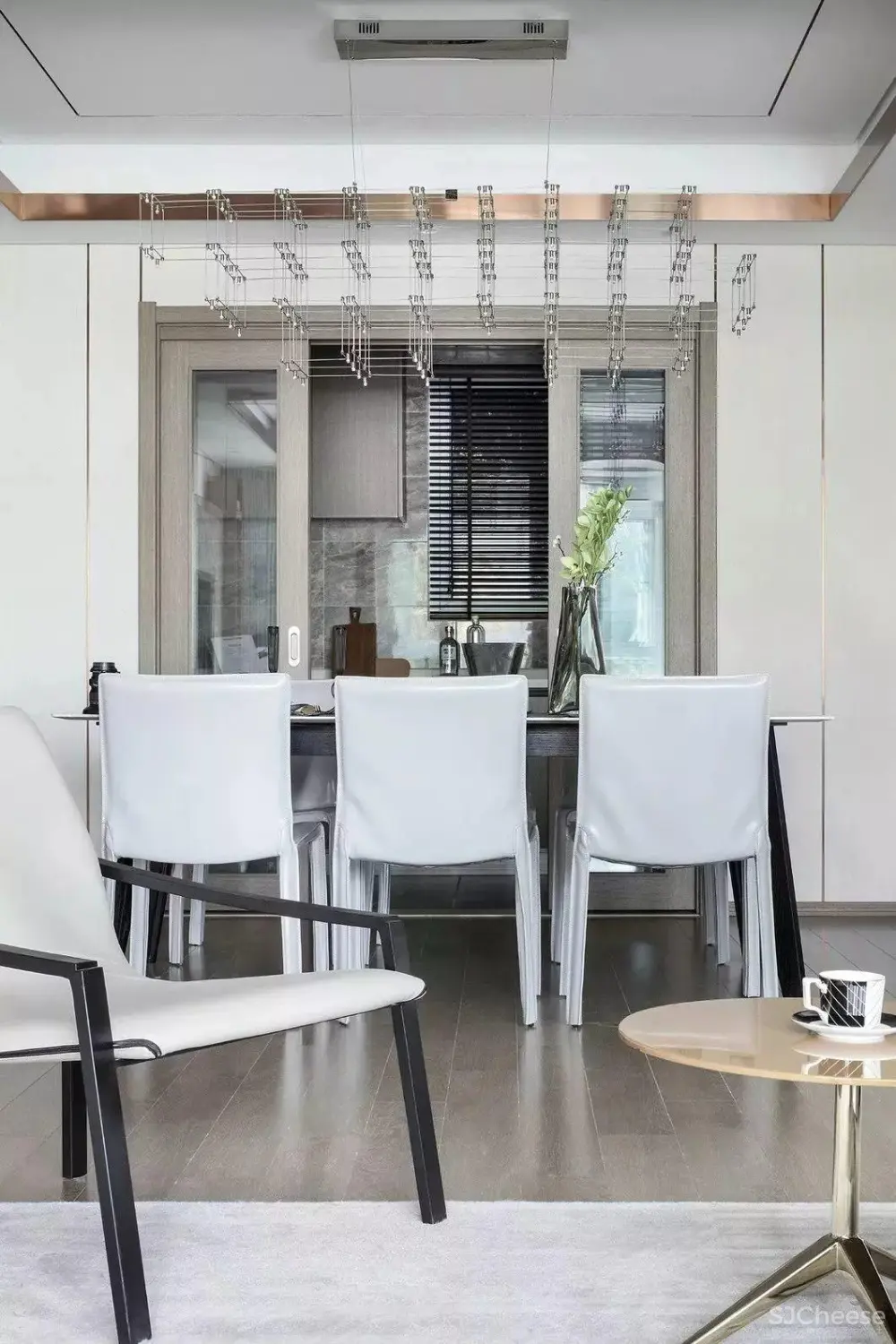 以白色打底衬托出餐厅理性时尚、干净爽利。零散造型的灯悬于桌面,和金属线条、方形布局形成一种和谐之美。