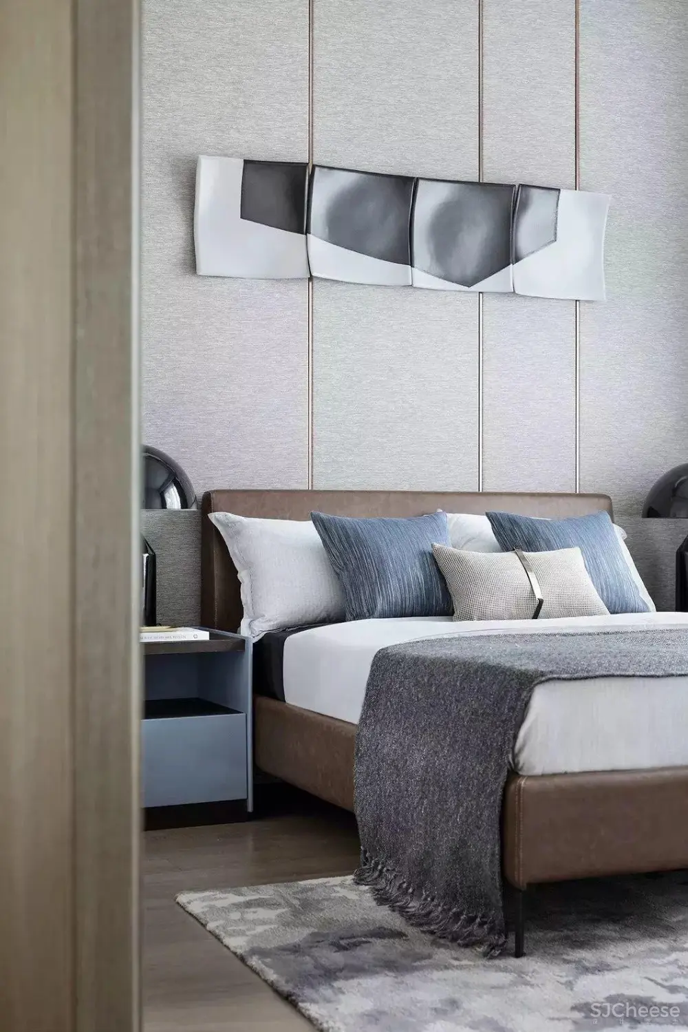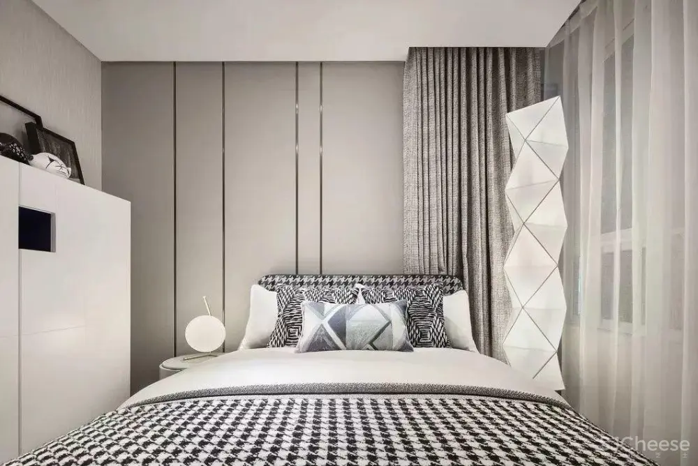 黑白组合的画作跳脱而出成为视觉焦点,灰色背景立面嵌入分割金属条,在长辈房生长出宁静优雅,悠然怡心的气韵凝聚于此。