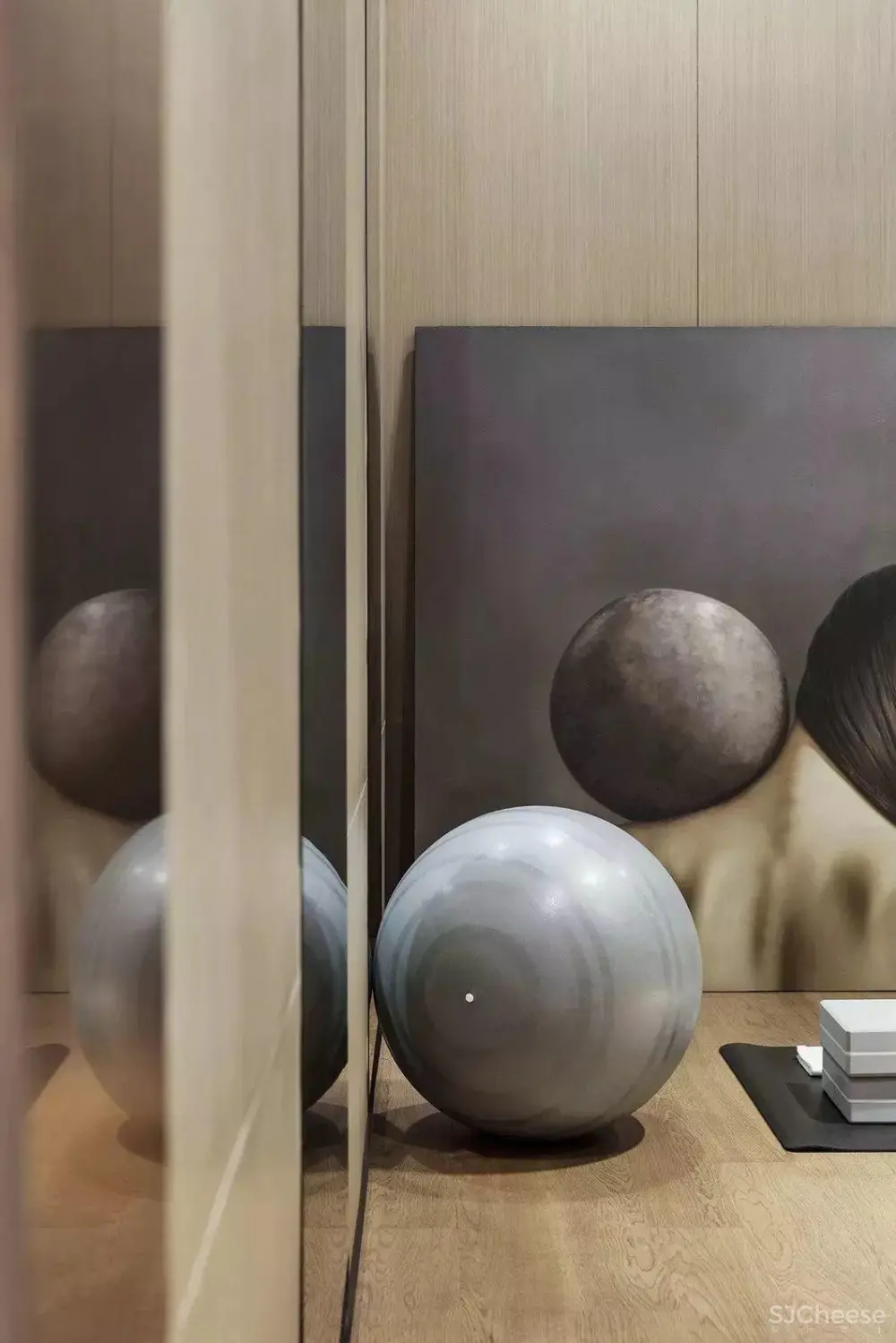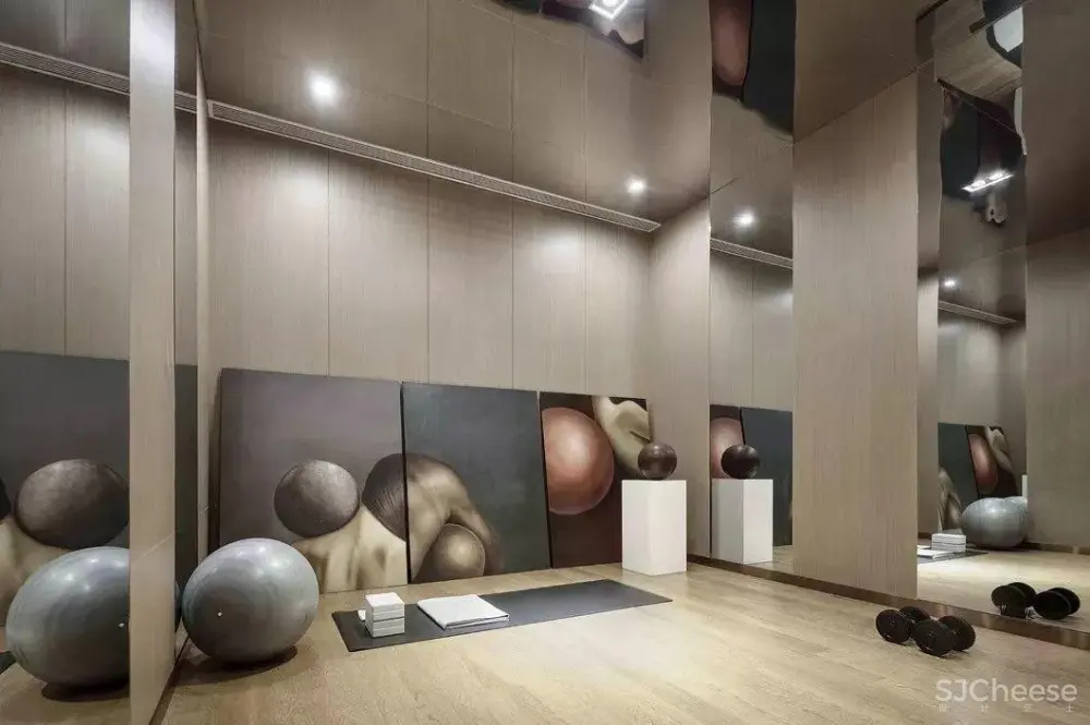 健身房以微幅缓降的曲线变化沉淀着室外的纷扰,于朴素中散逸轻灵阔达的艺术气息。瑜伽球与画作相得益彰,圆润的弧度和力学美感在此融为一体。