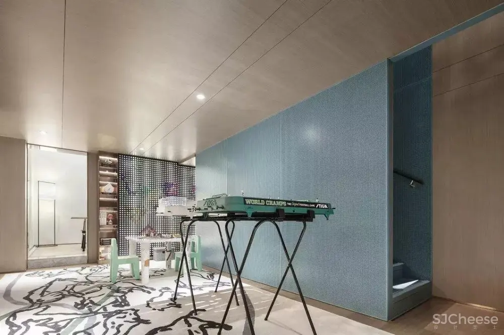 成人世界有着繁多的标准和功能,孩童游玩则是无拘无束的,因而在酒柜后侧区域设置桌面足球、冰球等游乐装置。
