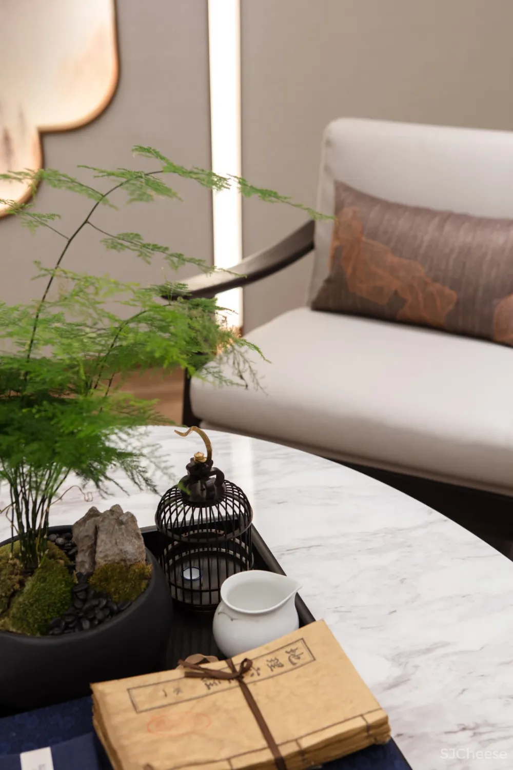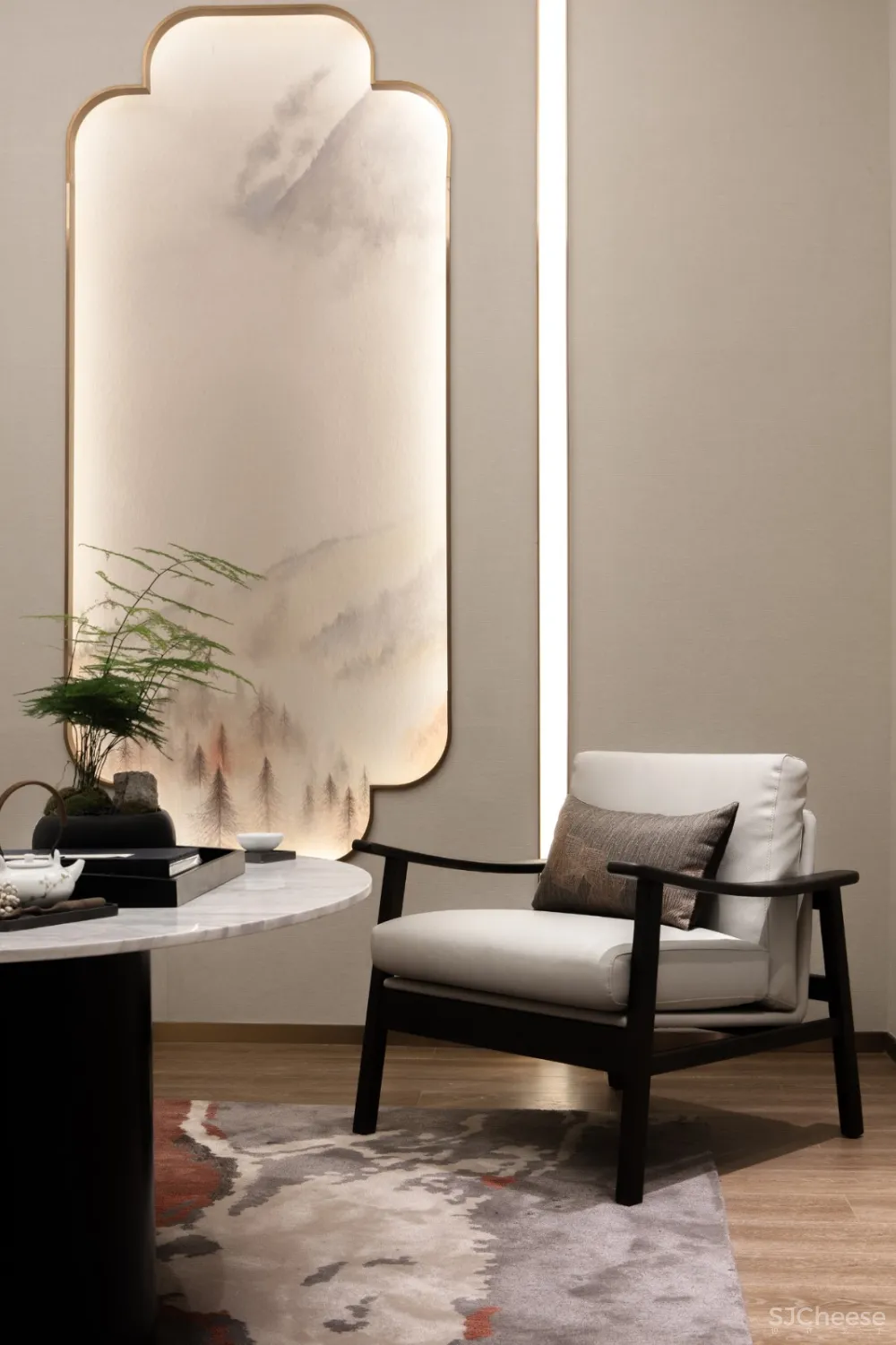 本案空间整体的视觉呈现是轻盈而蕴藉的,隽雅的气息凝结在空间的各个角落,各式或古意盎然或自然灵秀的的艺术小品,抒写着空间的人文气质,山水的抽象形态贯穿空间,结合古雅与现代兼容的的空间设色,造就了一室和雅安然的东方美境。