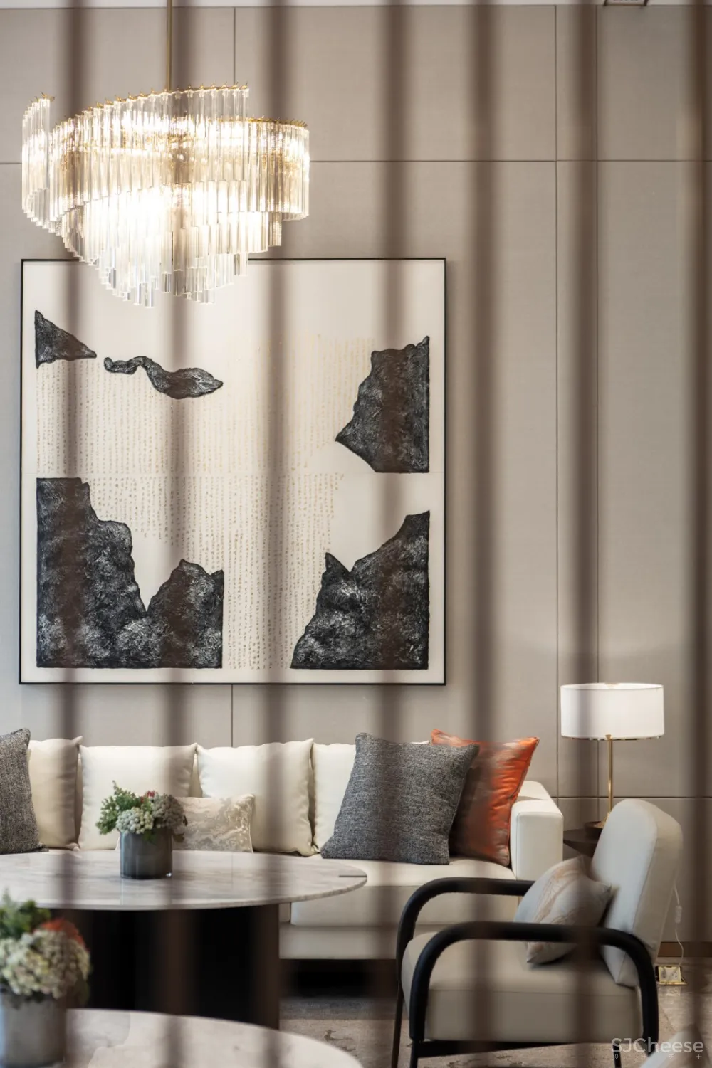 VIP室为半开放空间,软装陈设设计自然延续了洽谈区的雅致悠然感。设计师将徐州的人文山水的绰影转译于空间,于抽象黑白挂画中,仿若可窥得山石的嶙峋之姿,半透的轻纱挂帘隐现层层烟岚。