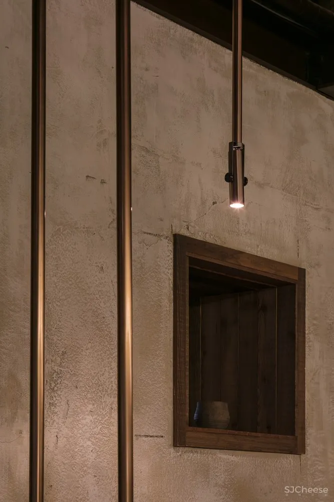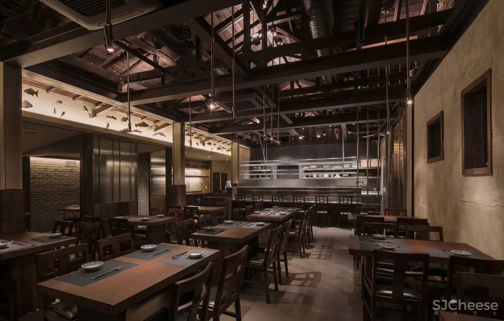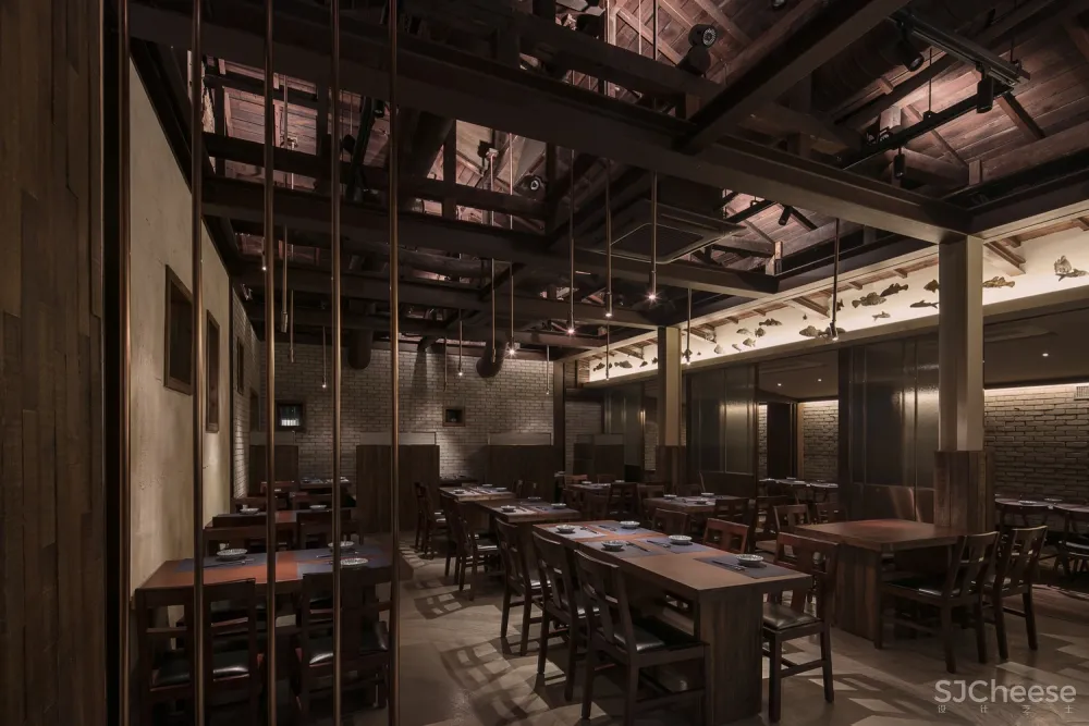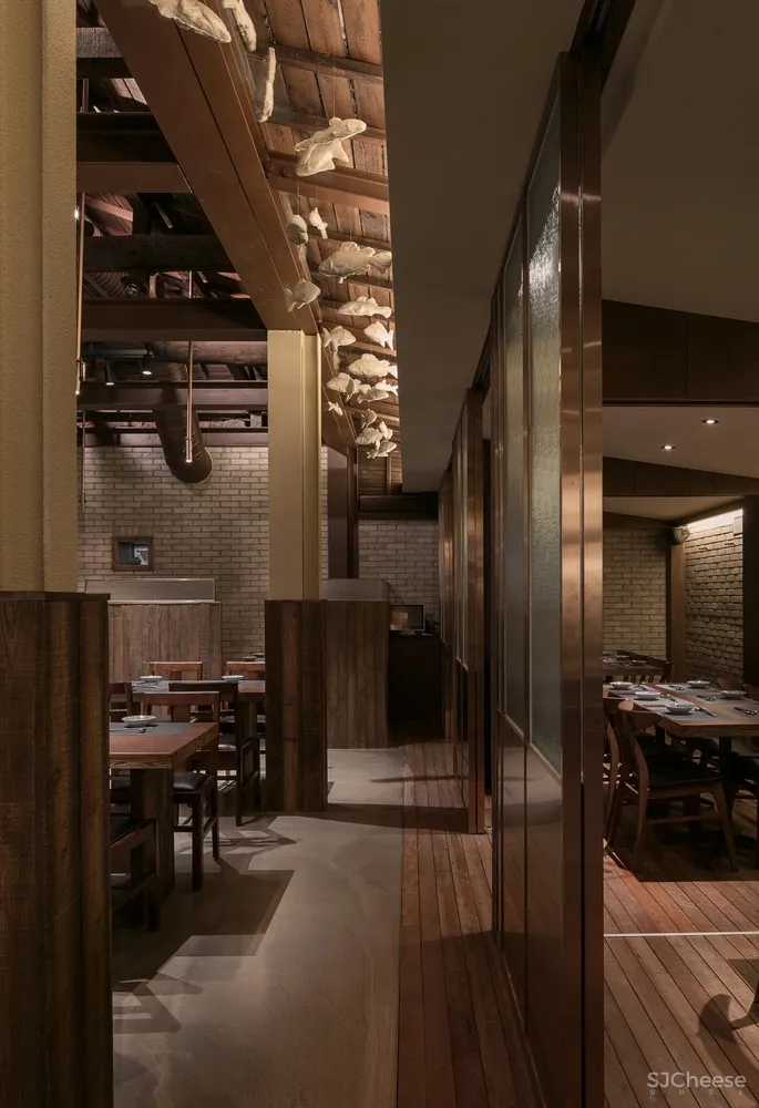 从斑驳的旧木屋架上悬垂下来的金属材料也是现代性的一部分表达。用餐大厅和包间之间的边界使用金属和玻璃组合成的滑动门来增添精致感;为突出用餐大厅的天花板,包间降低了内部天花板的高度,为顾客创造出舒适的空间氛围