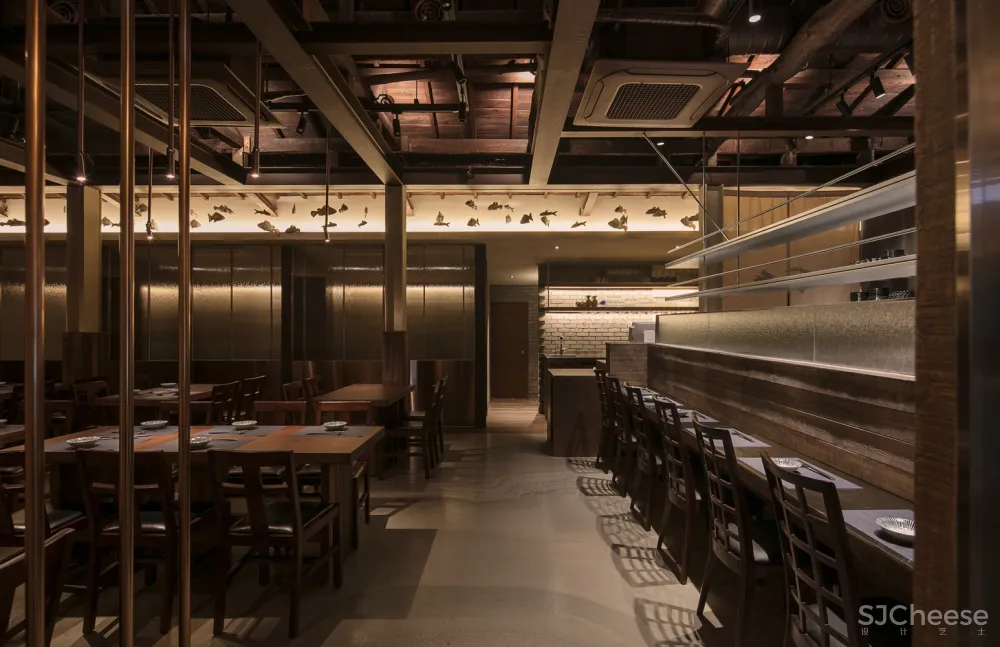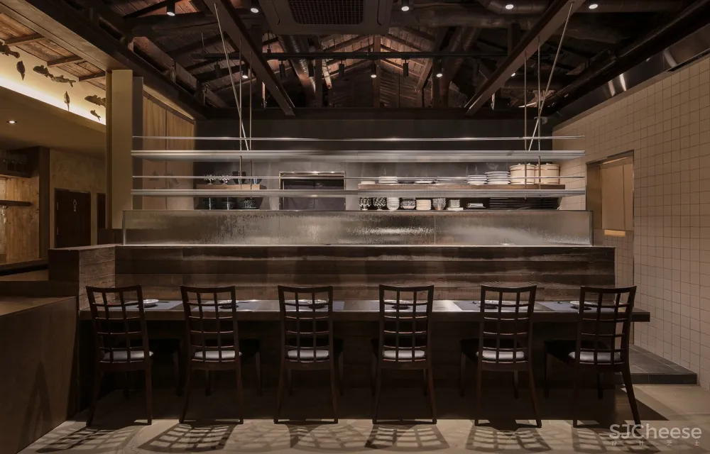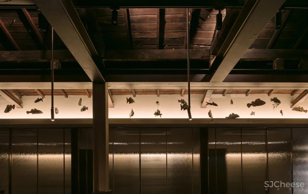 从斑驳的旧木屋架上悬垂下来的金属材料也是现代性的一部分表达。用餐大厅和包间之间的边界使用金属和玻璃组合成的滑动门来增添精致感;为突出用餐大厅的天花板,包间降低了内部天花板的高度,为顾客创造出舒适的空间氛围。