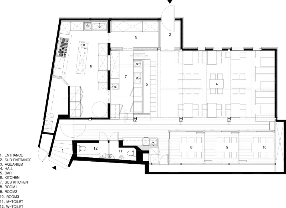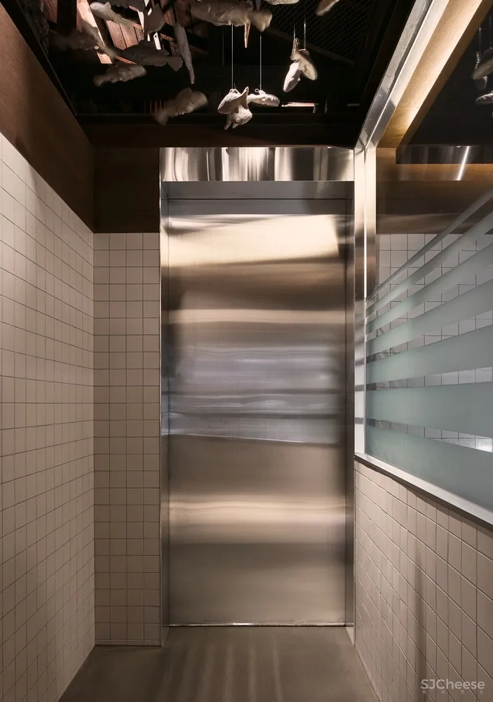 餐厅入口处被设计成一栋两层楼高的建筑形式,以弥补店面与整间餐厅大小相比显得过于狭窄的缺点,二楼悬挂的鱼群向顾客渲染着海鲜餐厅的氛围。