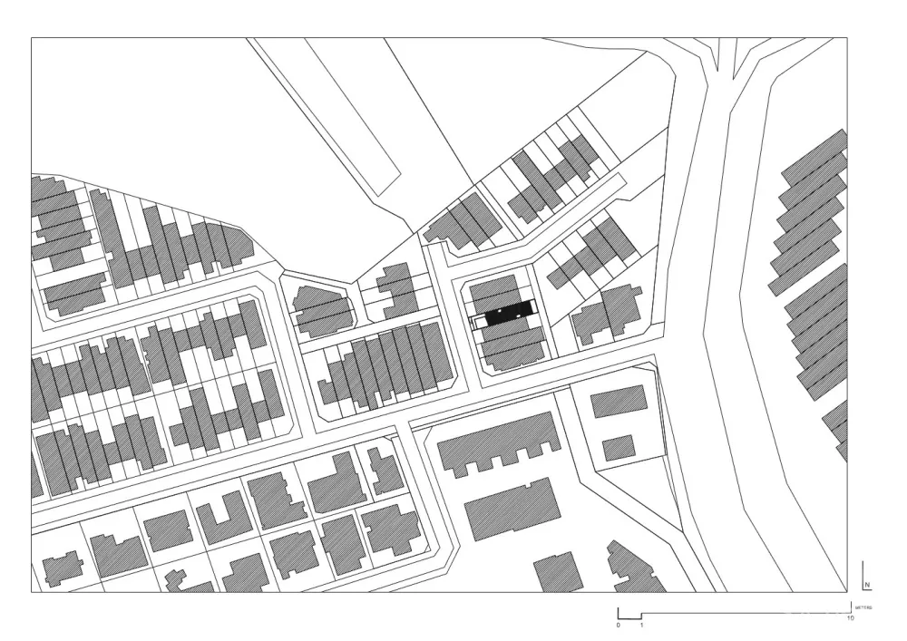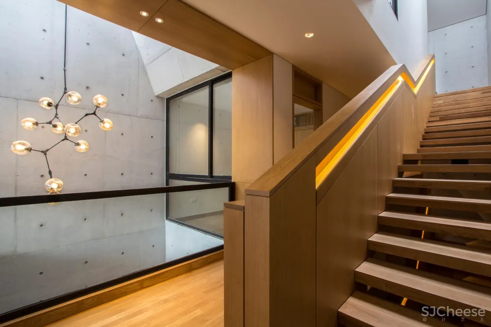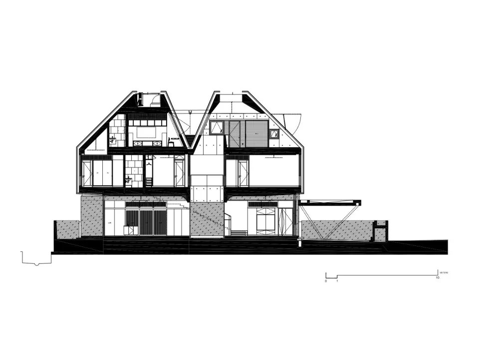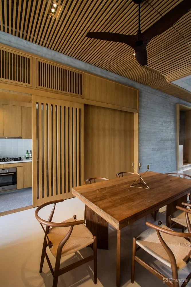 在这两个颇具戏剧性的体量之间是一个分隔房屋内部的户外庭院,通过屋顶露台联通室外空气,然后导向下方穿过卧室层进入到地面层的起居室和餐厅。庭院设有部分宽阔开口,它就像一个散热通气口使建筑依赖空调的使用降到最低。庭院在地面层的作用原理基于热分层原理,让低层积聚凉爽空气并在需要时才使用空调,同时令受热空气上升穿过庭院。