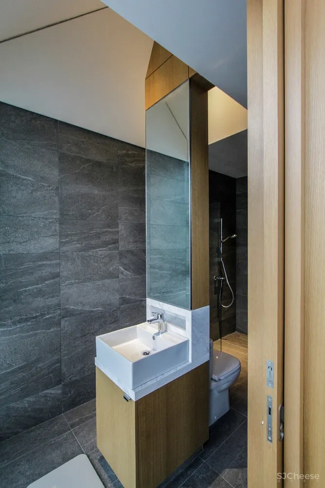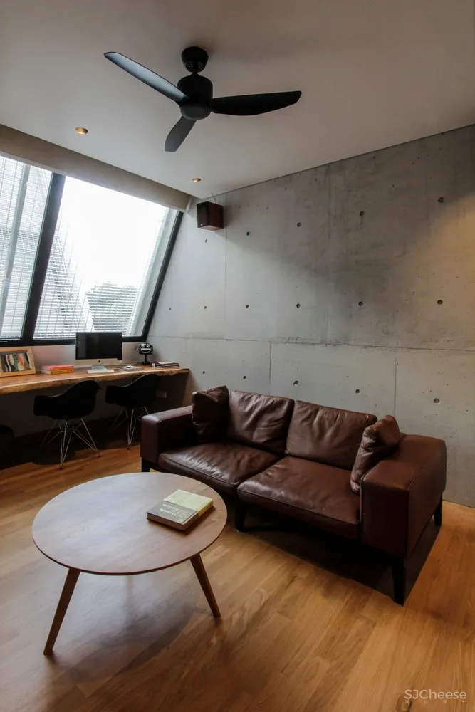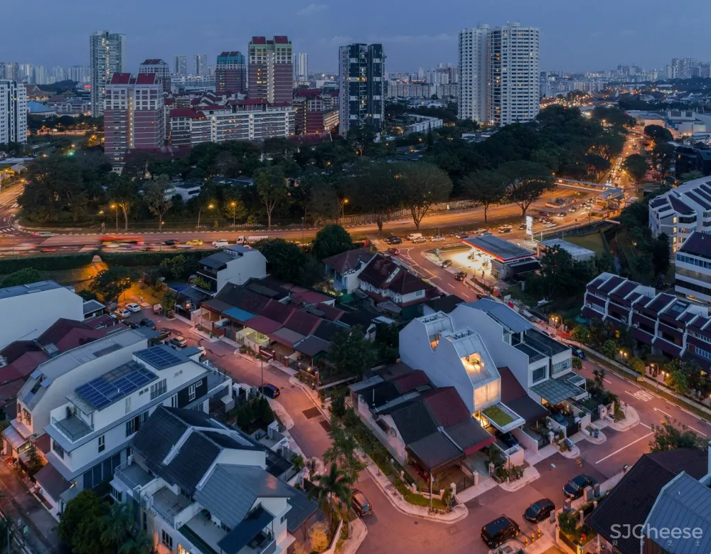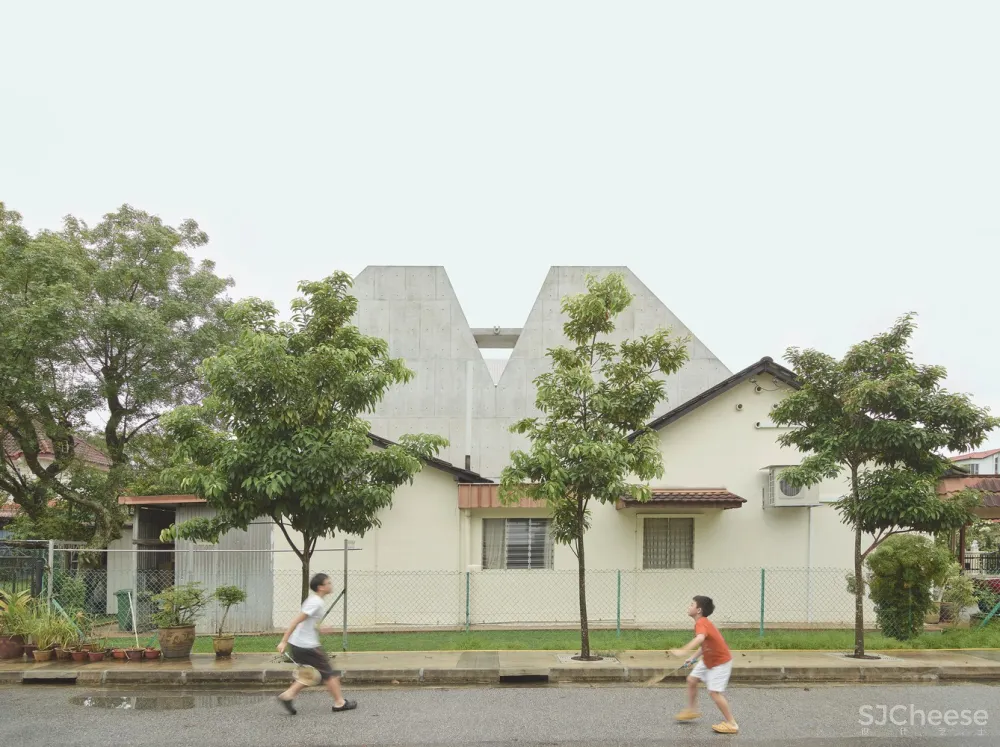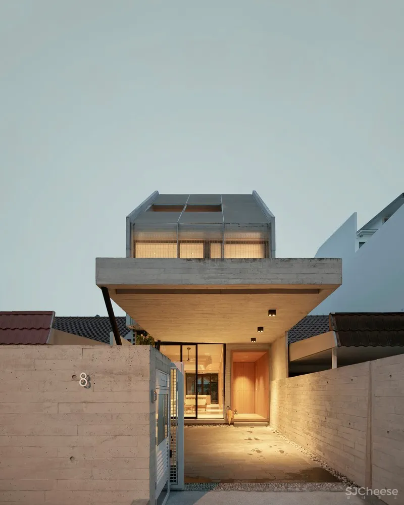 这栋风格简洁的露台住宅位于新加坡Windsor Park社区,由两个坡屋顶混凝土体块组成,包含几间私人卧室和顶层露台。这些体量被连续的铝制幕墙包裹着,减轻了热带赤道地区强烈的日照受热,同时让日光渗透到建筑深处。