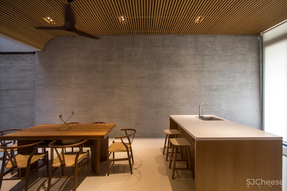 这栋简洁风格的露台住宅以削减为建筑理念,由简化平板材料构成的板状片体及脱模混凝土与白色橡木形成对比:减少材料、色彩的使用,通过空间体块的复杂化来增大光线、氛围的存在感,以及达到赤道地区湿热气候自然通风设计标准下的温热舒适性。