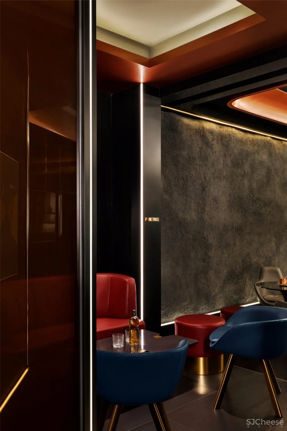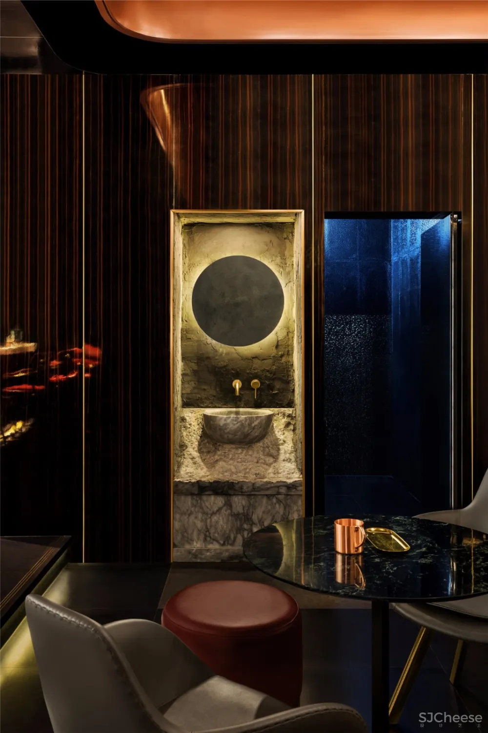 有趣的是,中间的散吧区延续了清水混凝土粗粝质感的审美,一整面不加修饰的墙体,对应着精致的“PINETREE”LOGO,愈发显现出矛盾而融合的设计美学。VIP区的洗手台,以清水混凝土搭配大理石,反复呼应,彰显出设计师对“生活”这一命题的思考——它不仅仅是精致的,更是复杂、多元的。