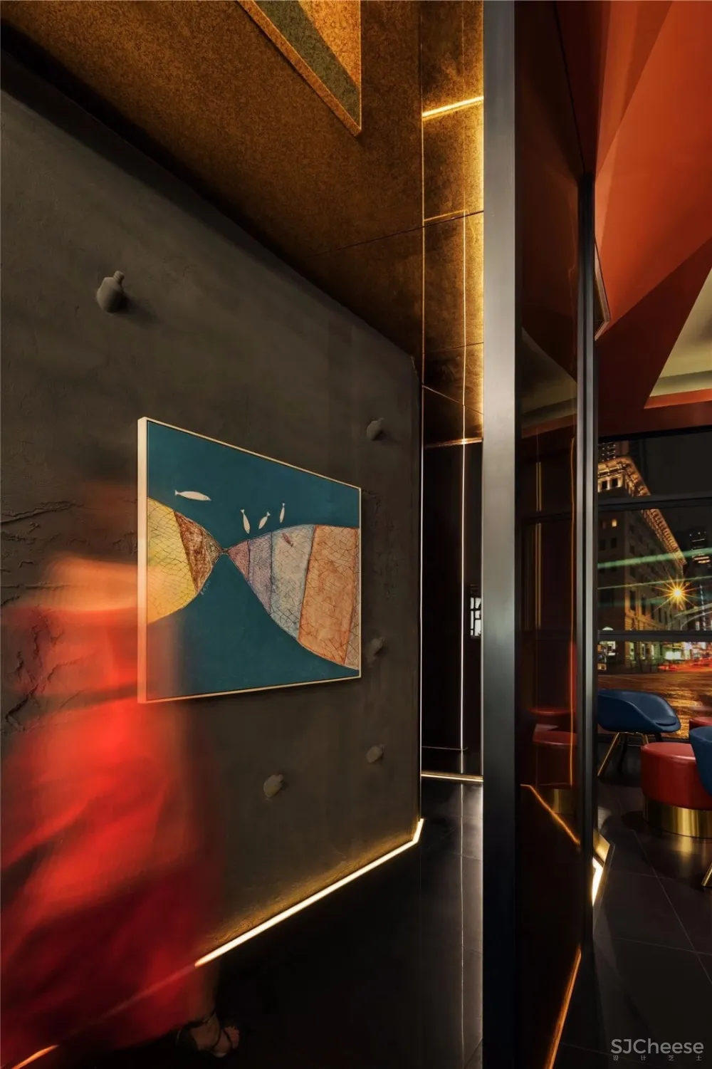 走廊艺术墙悬挂着年青艺术家的画作,湛蓝的大海,几尾鱼儿被彩色的渔网羁绊住,清冽而美好。艺术墙面的清水混凝土不甚平整,像是海滩,几个酒瓶陷在滩涂里,艺术的张力与廊道的光影形成一种反差的对抗美学。