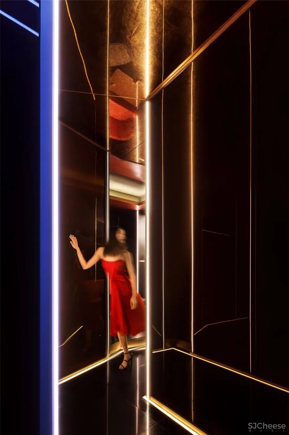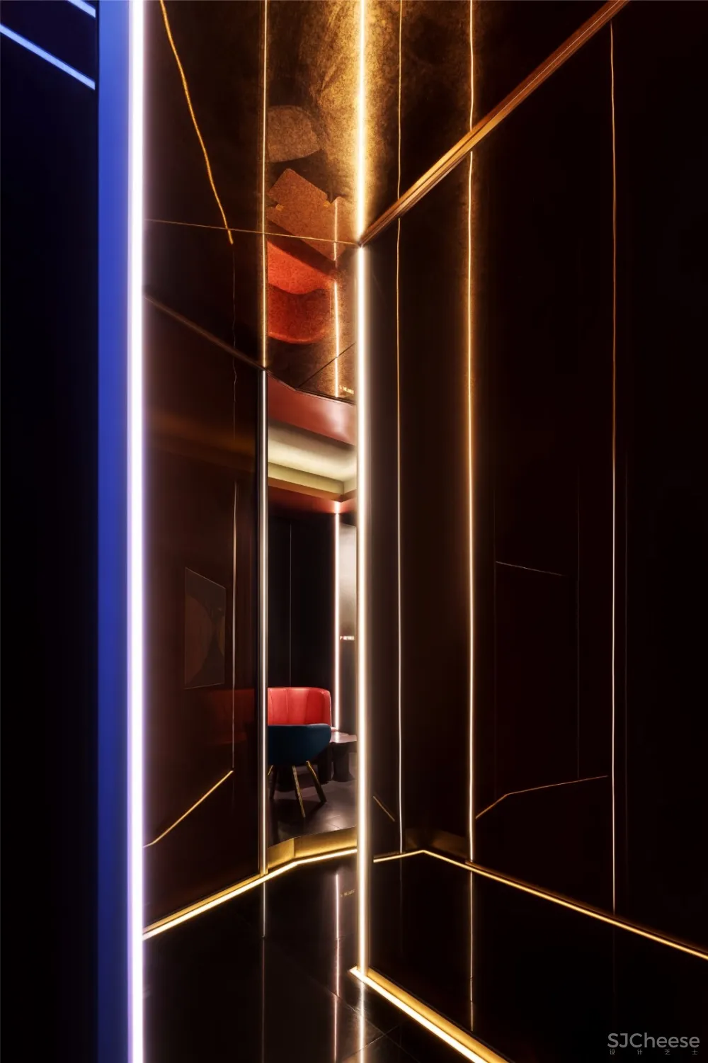 设计师以建筑的视角重构空间体量,藉由玻璃及墙体等界面打造出多样性空间体验。呼应《桃花源记》中所载,“山有小口,仿佛若有光。便舍船,从口入。初极狭,才通人。复行数十步,豁然开朗。”曲径通幽的艺术走廊即是寻找“桃花源”的空间铺垫,也是“洞穴”的路口。步行其间,首先印入眼帘的是一幕线型灯,它们纵横聚合,光影随着镜面的倒映而波光潋滟,静静流淌。夹道两侧,一侧是清水混凝土艺术墙,不羁而自由,另一侧是玻璃墙,以灯带分割,光的反射让逼仄的空间也有了通达的视觉效果。