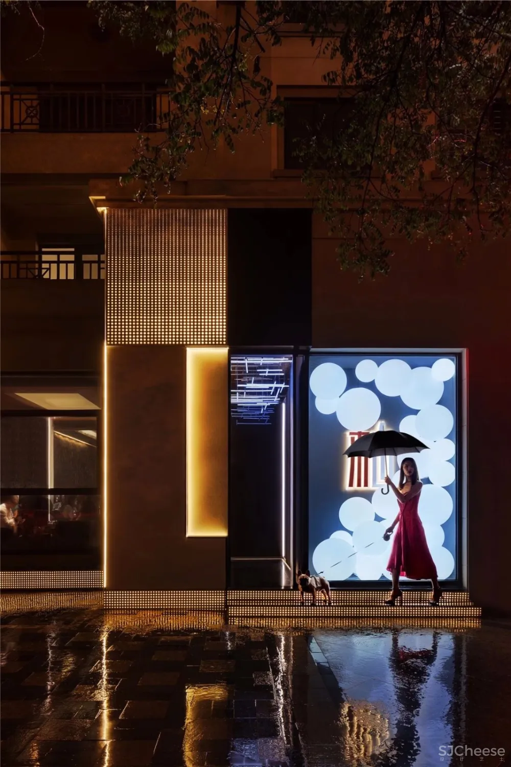 位处郑州的PINETREE柏吧,入口不大,却留了一面大橱窗,简约利落的“柏”字LOGO居于其中,白色球体轻盈地漂浮其间,犹如夜明珠在暗夜里闪烁着光芒,吸引一对对寻觅的眼睛。门面上方及脚踏处外置有金属穿孔板,光从孔洞里暖暖透出,与入门处及橱窗内的蓝光形成反差,相当利落地勾勒出建筑的外立面。