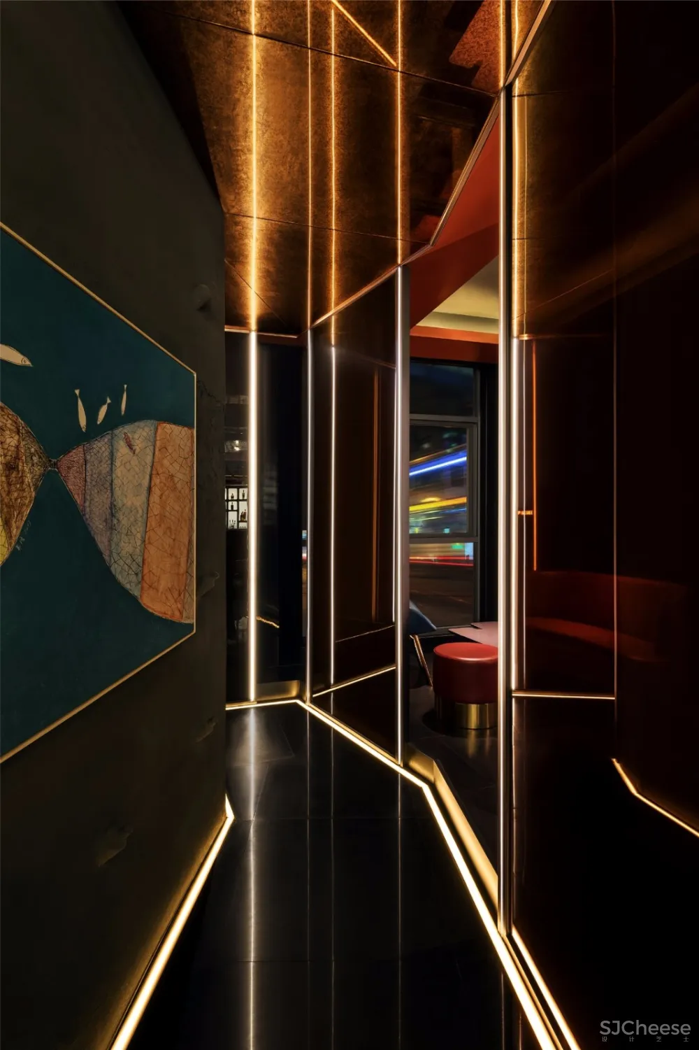 这间酒吧面积不大,走廊的置入看似将空间划分成零散的版块,但设计师擅于化整为零,灵活变幻,让酒吧区的吧台、散台区、VIP区,甚至是走廊,都被打通成灵活的区块,通过玻璃界面,让空间之间隔而不断,互为表里。