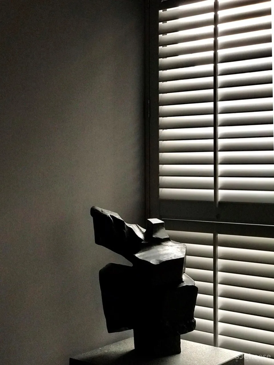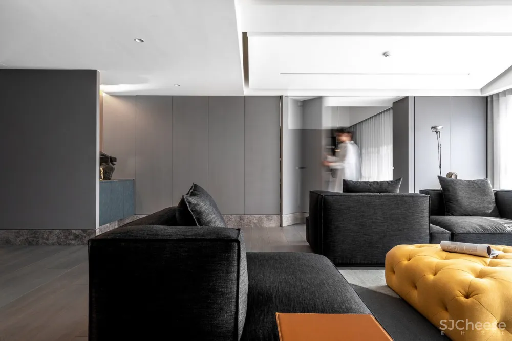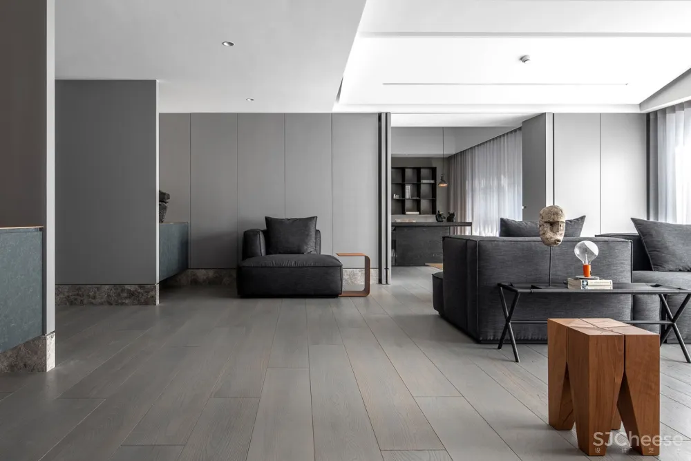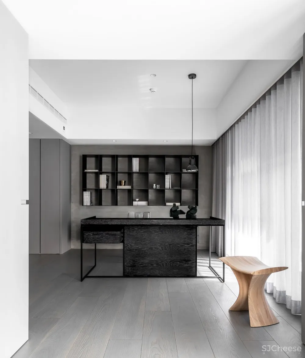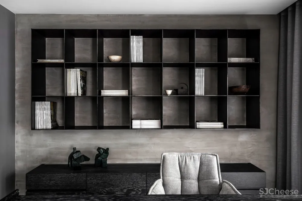 整体空间以灰白为主要色系,中性的色系,亦传达了居者内心中庸之道的那把尺度。灰白淡雅的空间,许多细节隐入其中,灰白仿古面石材踢脚,深邃的沟缝,简易有力地勾勒出立面线条。灰白色的冷喷漆墙面,壁布及石材的交迭运用,使得立面在细节处理上更显细腻。书房水泥静谧的氛围及展示区的铜质及灰质的手工漆面,都增添了空间的精神感受及视觉感受的变化。