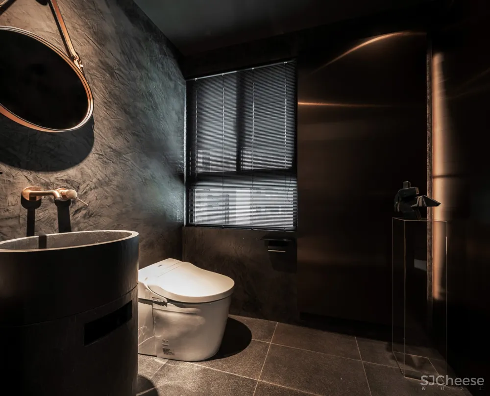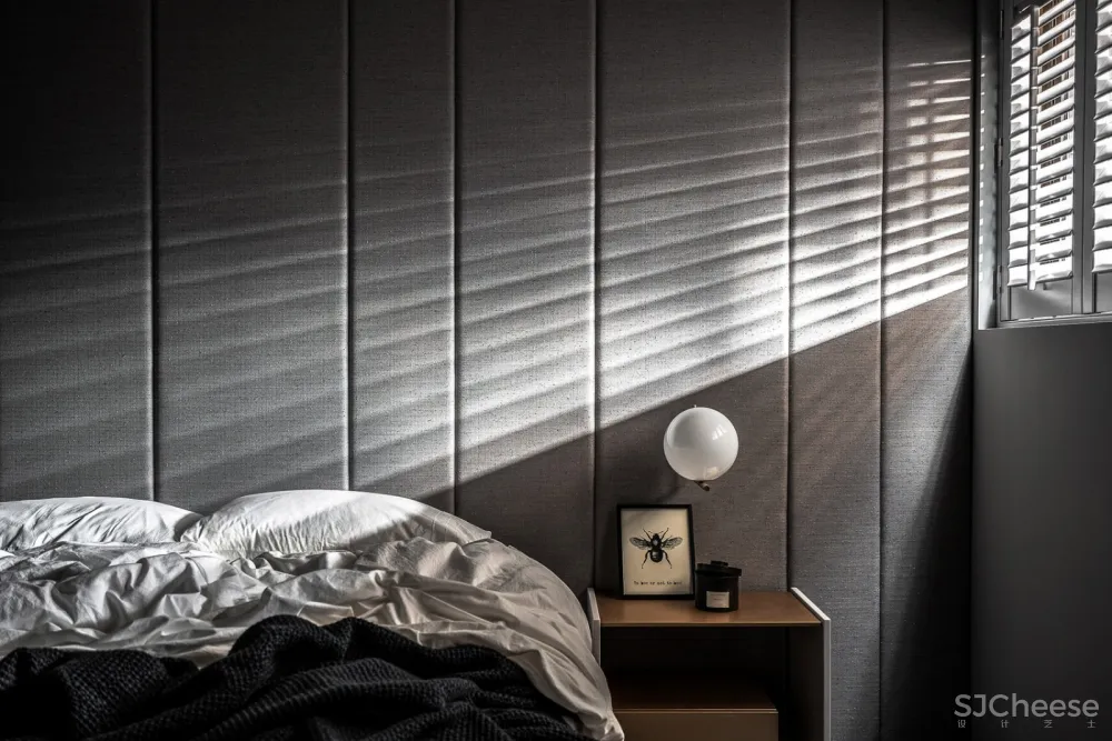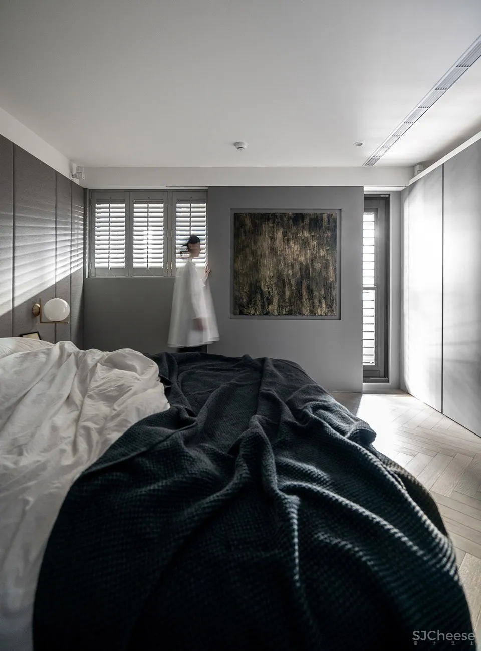 沿着简易淡雅的灰白色壁布廊道,进入了令人舒适的主卧空间。没有过多的装饰表现,多的是一份慵懒撒入室内的阳光及那幅隐喻居者内心刚毅的创作。减少干扰后的那份平淡,不正是主卧空间应回归的原貌。主卧浴室以黑色为主要色系,给予人们神秘的感受,然另一层面而言,黑亦代表着时尚。古朴质感处理的蛇纹石黑白纹理,赋予黑色神秘一种蕴含层次的变化,散发诱人的气息。
