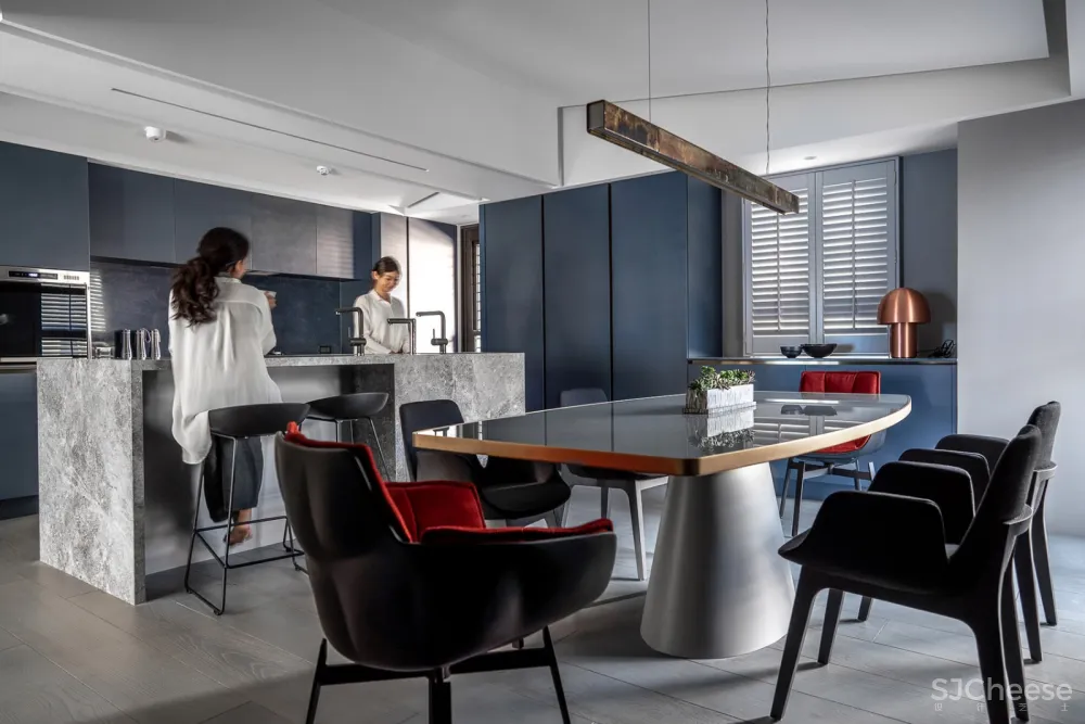 方块几何的变化,使得空间场域尺度的界定被打破,规律、跳跃、律动、随心所至。所有过往成规的条文,不复存在。而斜式顶蓬轴线的延伸,串连了起居及饮食空间。除了延续原有整体灰白的色系,线条简约利落,灰蓝橱柜围绕着空间,搭配手作炙烧的铜质吊灯,光滑平顺的柜体漆面,结合因炙烧而产成质变的铜,其碰撞出的视觉变化,和起居场域的家具一样,如同嬉皮般,追求那份自律性的自由,不在乎别人的眼光,勇敢的活出自己。