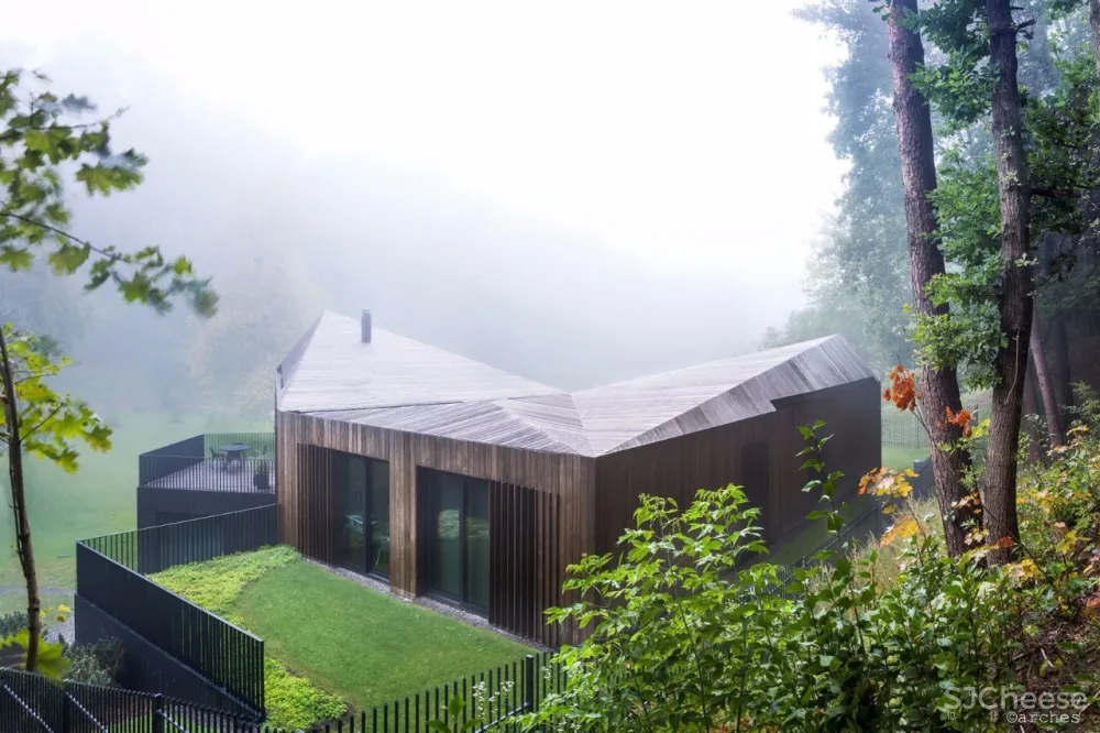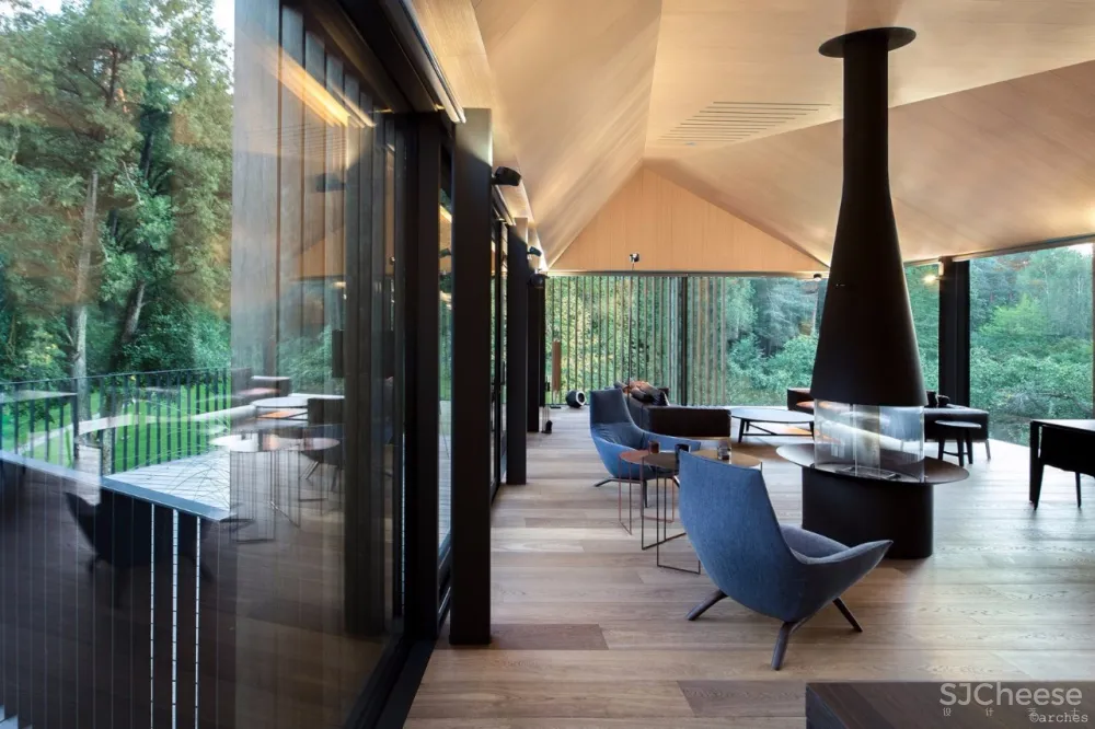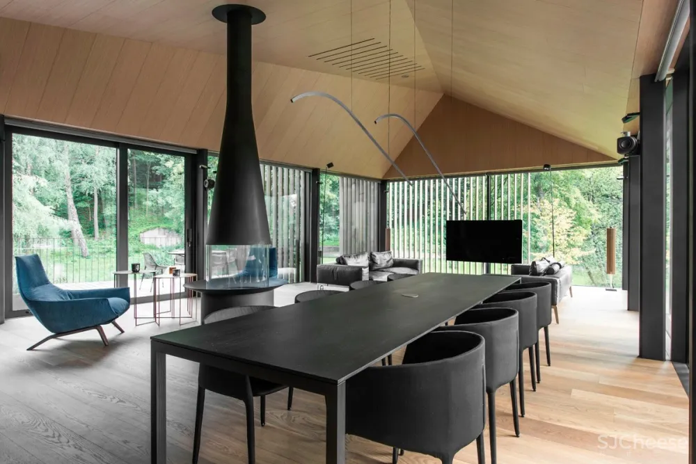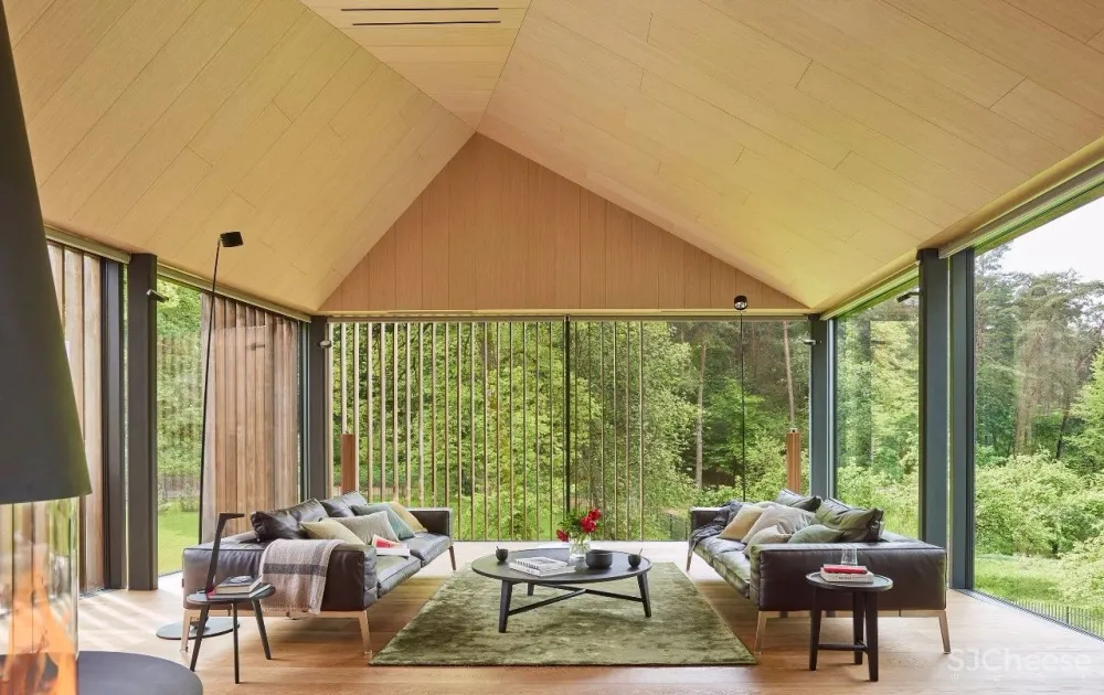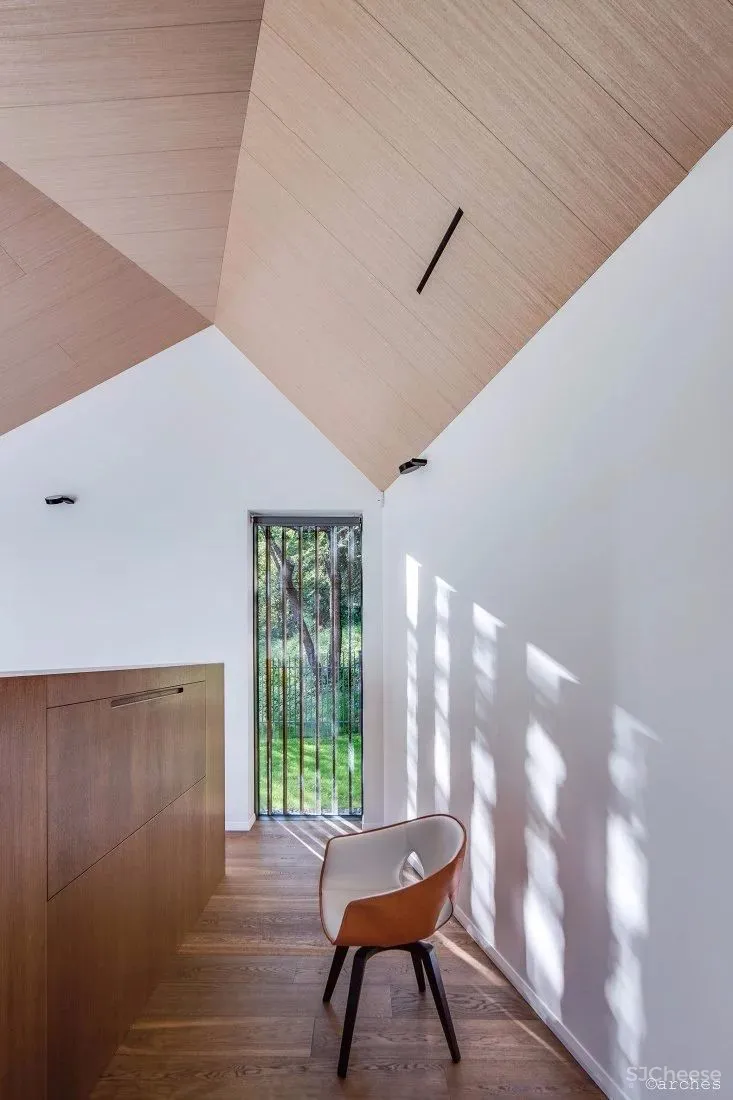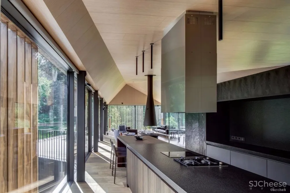 不规则倾斜屋顶,四面都是大面积落地窗,引景入室,现代和传统完美平衡。