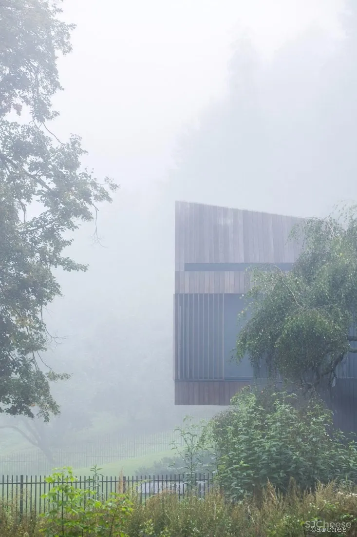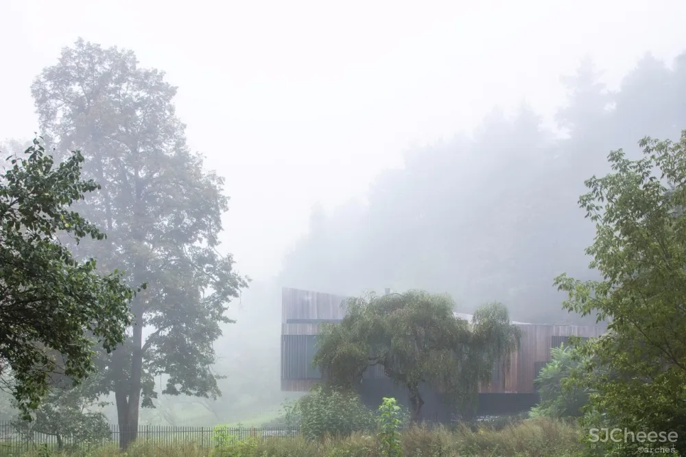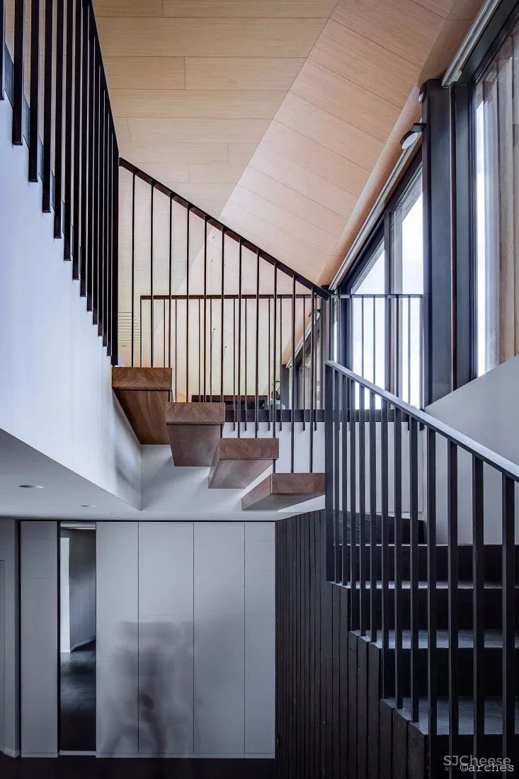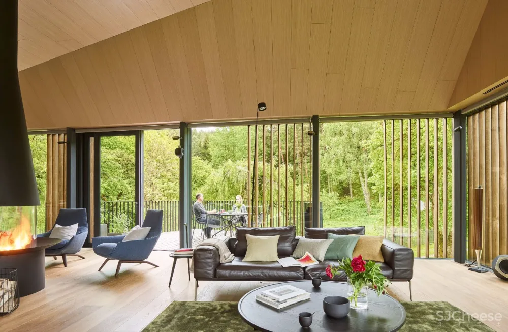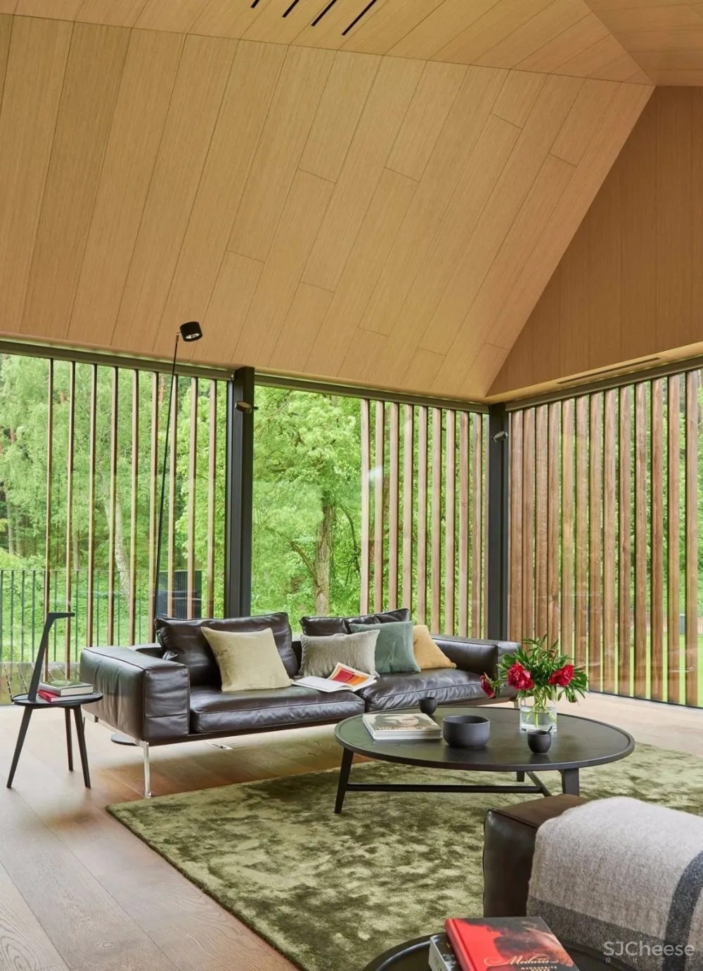 不规则倾斜屋顶,四面都是大面积落地窗,引景入室,现代和传统完美平衡。